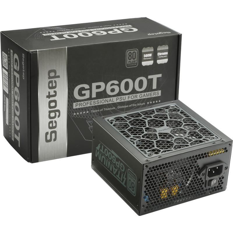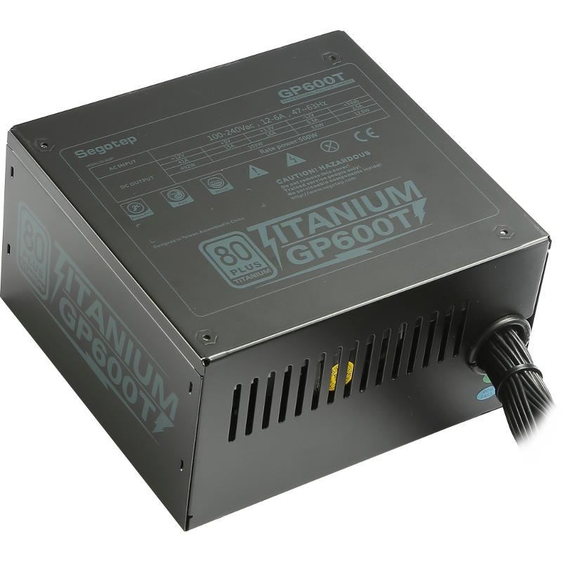 Segotep GP600T 500W PSU, certificata 80 PLUS Titanium, eficienta maxima 96%, single rail (41A), tehnologie DC-DC, ventilator silentios de 120mm cu control termic automat, 2x 6+2pin PCIE, 5x SATA, 3x Molex, 1x 4+4pin EPS12V (lungime 650mm), protectii: OVP/OCP/OPP/SCP/UVP, Active PFC, ATX 12V v2.31