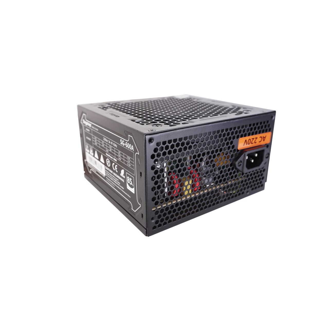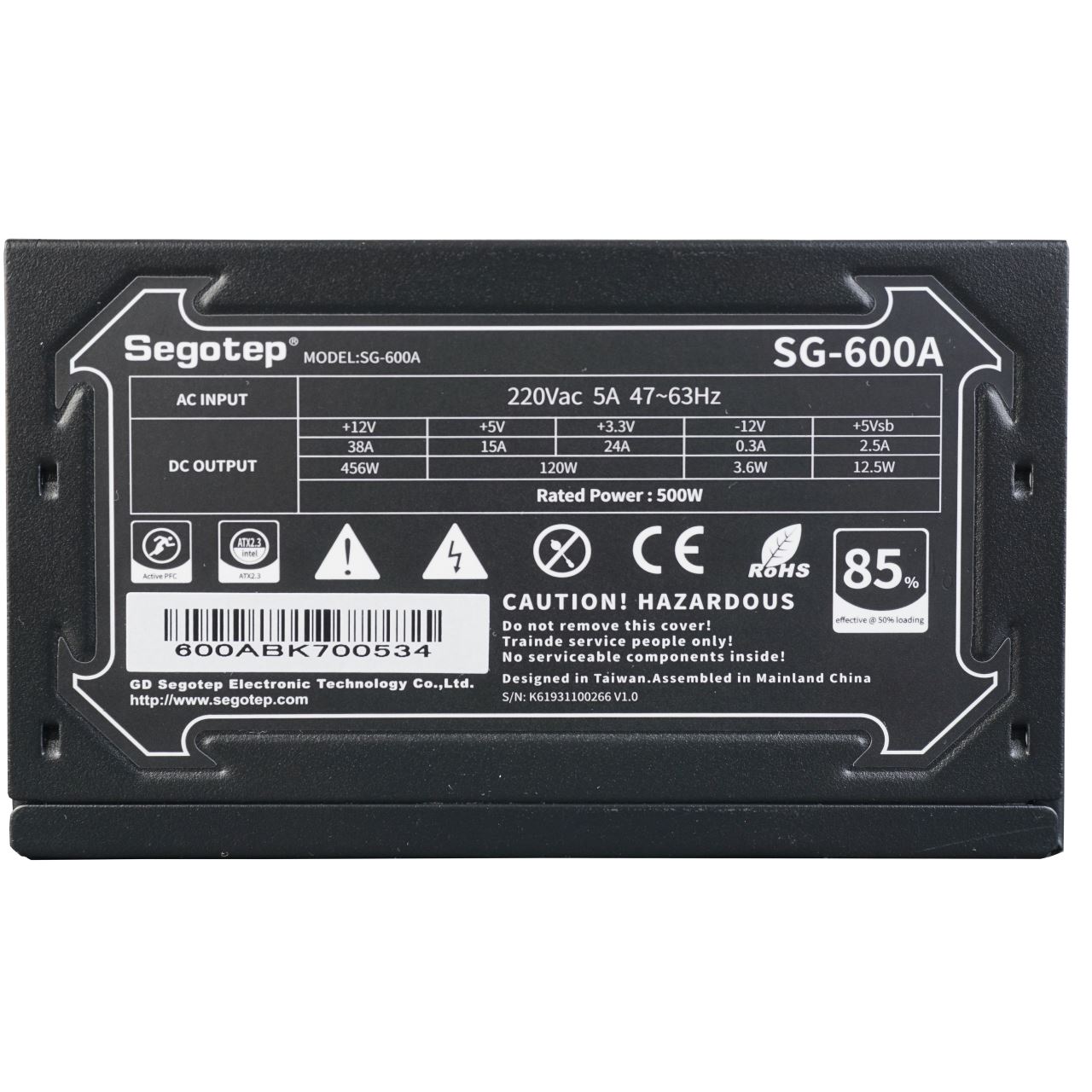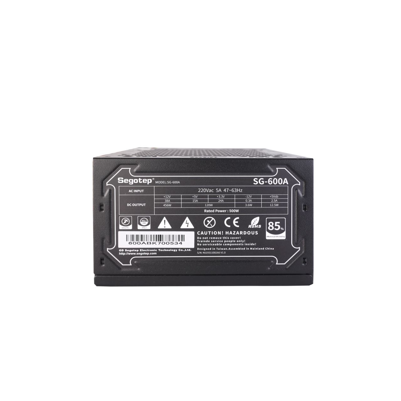 Sursa Segotep SG-600A 500W, eficienta 85%, single rail: 38A, ventilator silentios de 120mm cu control termic automat, 2x PCIE 6+2pin, 3x SATA, 2x Molex, 1x EPS12V 4+4pin (55cm lungime), 1x 20+4 pin (45cm lungime), OVP/OCP/OPP, Active PFC, ATX 2.31, suporta SLI/Crossfire