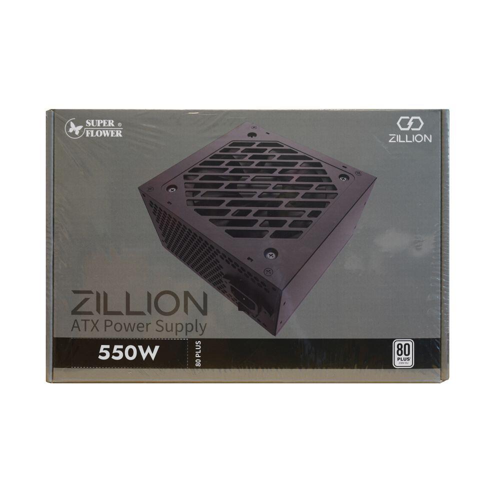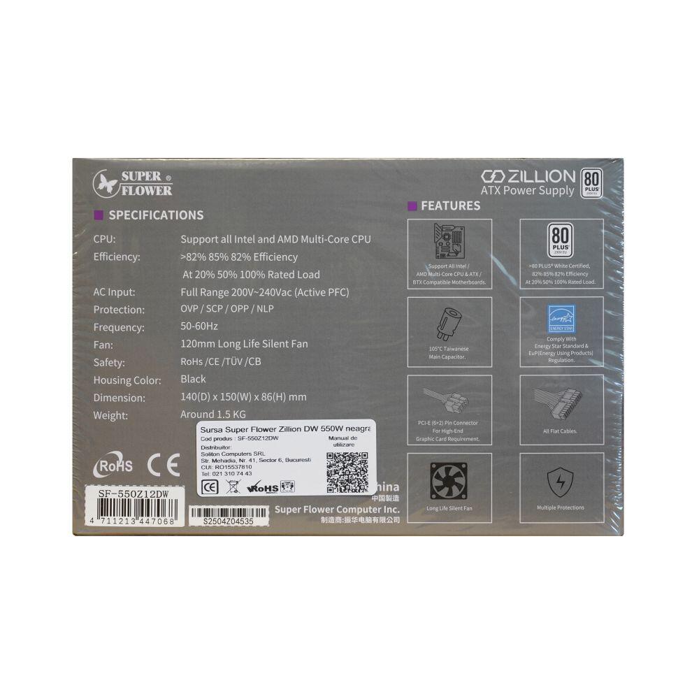 Sursa Super Flower Zillion DW 550W neagra 80 Plus White, certificata 80 PLUS White, eficienta 82%, cabluri plate pentru un wire management mai bun, single rail (42A), ventilator silentios de 120mm (Silent Fan), condensatori taiwanezi 105°, 2x 6+2pin PCIE, 4x SATA, 2x Molex, 1x 4+4pin EPS12V (600mm), 1x 24pin (500mm), protectii OVP/SCP/OPP/NLP, Active PFC, ATX 12V v2.32, SSI EPS 12V v2.92, dimensiuni (LxWxH): 140x150x86mm, certificari: TÜV/CB/CE/RoHS, greutate: 1.5kg