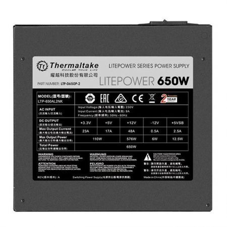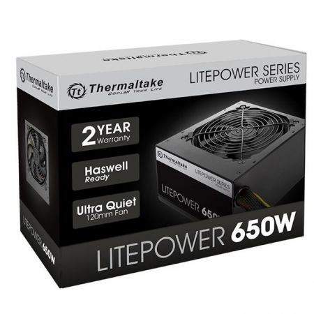 Thermaltake Litepower 650W PSU, single rail (48A), ventilator silentios de 120mm cu control termic automat, 2x 6+2pin PCIE, 5x SATA, 6x Molex, 1x Floppy, 1x 4+4pin EPS12V, SCP/OVP/OPP, Active PFC, compatibila cu standardele ATX 12V V2.3 & EPS 12V, dimensiuni (w/h/d): 150 x 86 x 140mm