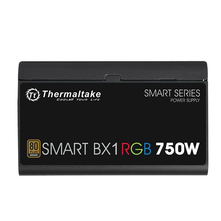 Thermaltake Smart BX1 RGB 750W PSU, certificata 80 PLUS Bronze, eficienta pan la 88%, single rail (56A), ventilator silentios de 120mm cu control termic automat, buton pentru contolul culorii de iluminare a ventilatorului (iluminare continua Red/Green/Blue/Yellow/Purple/Light Blue/White, Pulse, ciclu culori si LED Off mode), 4x 6+2pin PCIE(650mm), 8x SATA, 4x Molex, 1x Floppy(adaptor), 1x 4+4pin EPS12V(650mm), 1x 24pin(600mm), OVP/OPP/SCP, Active PFC, dimensiuni (H x W x D): 86x150x140mm