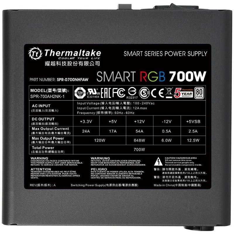 Thermaltake Smart RGB 700W PSU, certificata 80 PLUS, eficienta 82-86%, single rail (54A), ventilator silentios de 120mm cu control termic automat, buton pentru contolul culorii de iluminare a ventilatorului (Red/Green/Blue/Yellow/Purple/Light Blue/White, 256 Color RGB Cycle, Solid Red/Green/Blue/Yellow/Purple/Light Blue/White, and a LED Off mode), 2x 6+2pin PCIE, 6x SATA, 5x Molex, 1x Floppy, 1x 4+4pin EPS12V, OVP/OPP/SCP, Active PFC, dimensiuni (H x W x D): 86x150x140mm