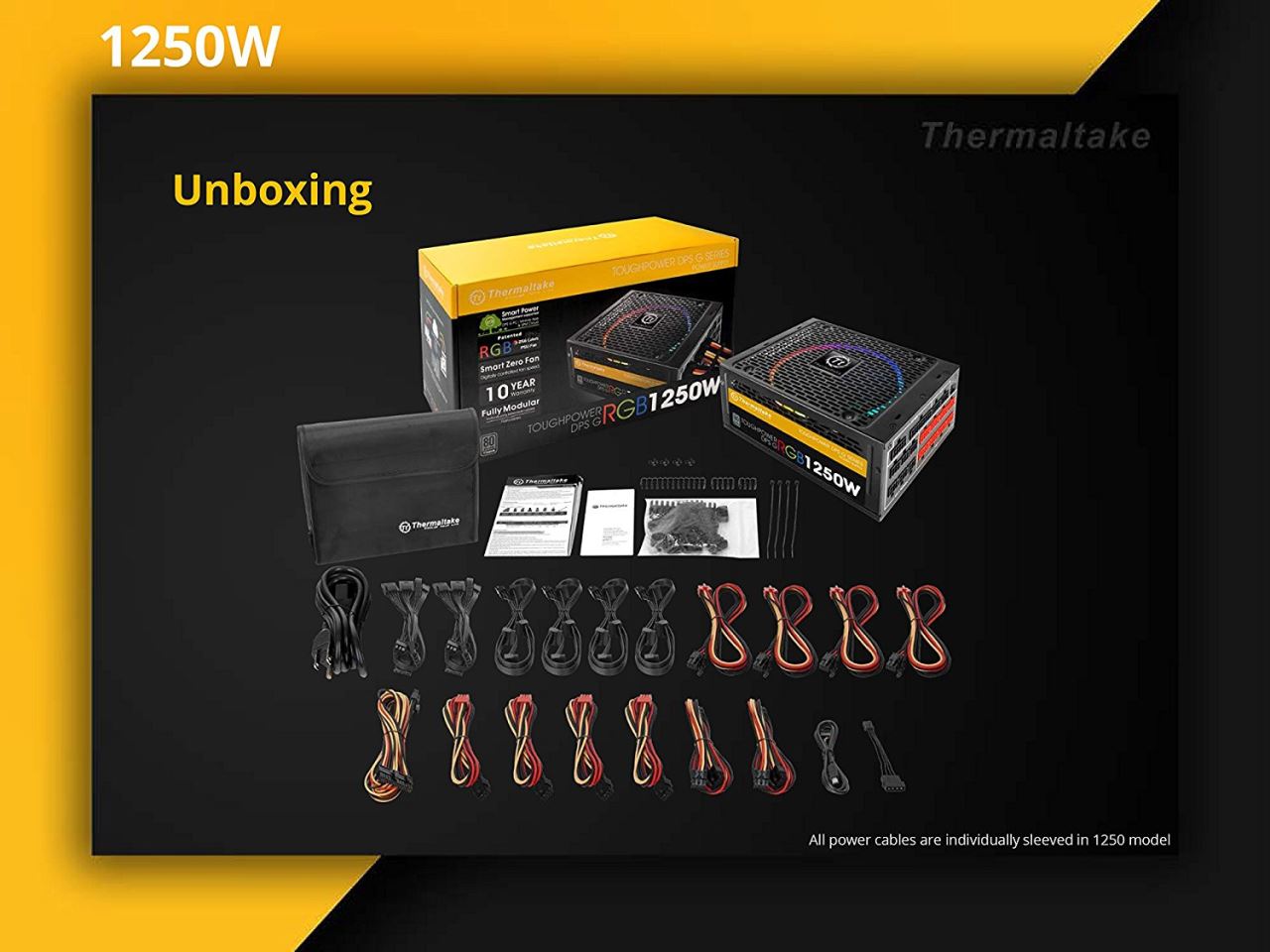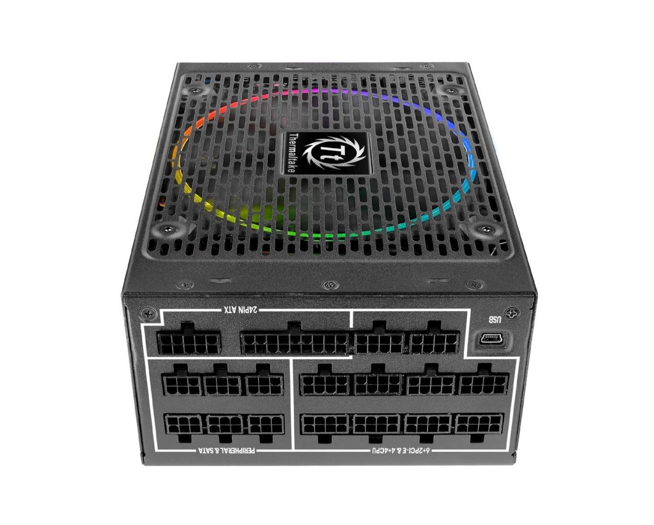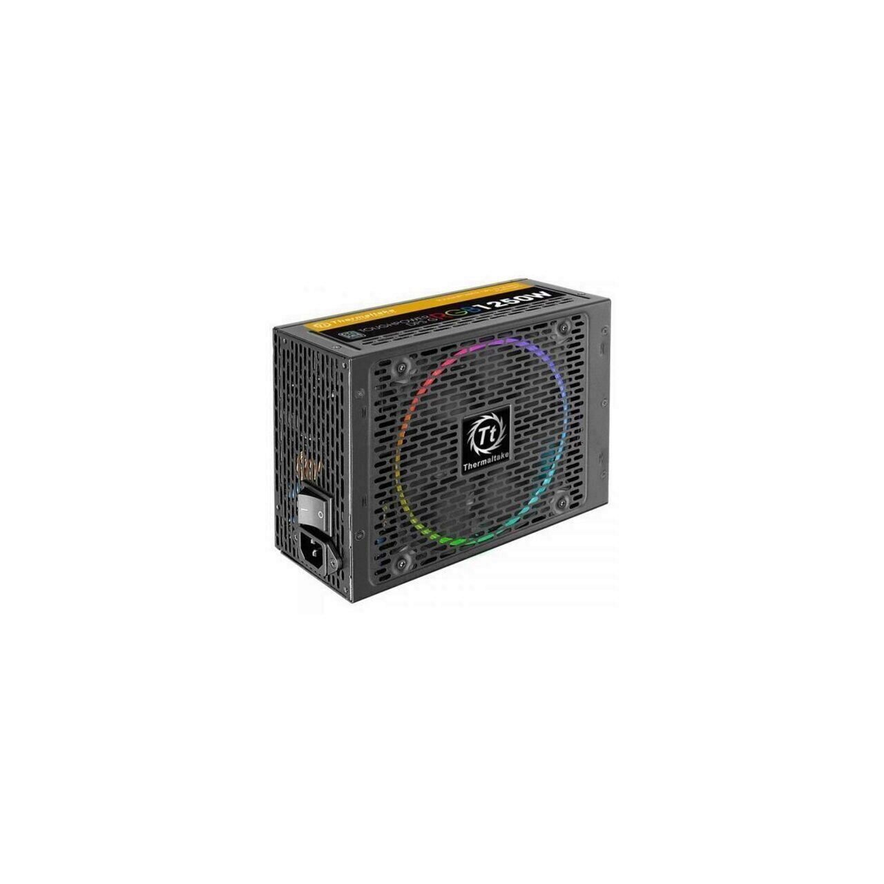 Thermaltake Toughpower DPS G RGB 1250W Titanium Full Modular Digital PSU, certificata 80 PLUS Titanium, sursa digitala ce permite monitorizarea (voltaje, temperatura, consum, eficienta), controlul (viteza ventilator, voltaje) sau calcularea costului curentului consumat prin intermediul a mai multe aplicatii (SPS G Smart Power Management Cloud, DPS G PC APP, DPS G Mobile APP), cabluri full modulare plate pentru un wire management mai bun, single rail (104A), condensatori electrolitici japonezi, ventilator silentios de 140mm cu control termic automat si iluminare RGB ce poate fi controlata prin software, 4x 6+2pin PCIE, 4x 8pin PCIE, 16x SATA, 8x Molex, 1x Floppy (prin adaptor), 1x 4+4pin EPS12V, 1x 8pin EPS12V, SCP/OVP/OCP/OPP/UVP, certificari: CE, TUV, FCC, UL/CUL, BSMI, CCC, Active PFC, dimensiuni (w/h/d): 150 x 86 x 200mm, compatibila cu standardele ATX 12V 2.31 & SSI EPS 12V 2.92
