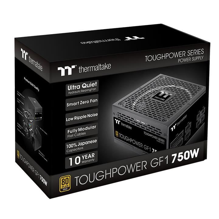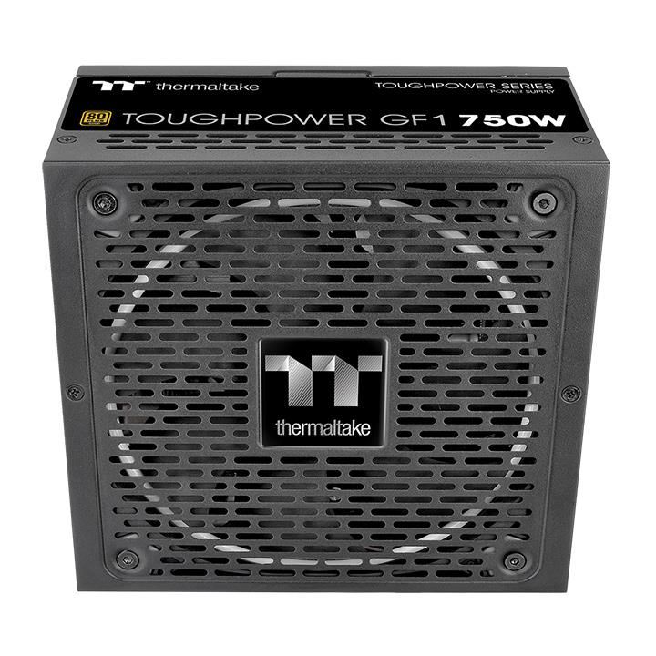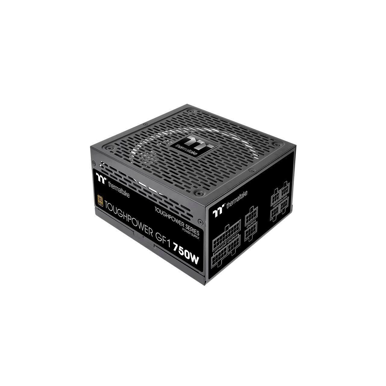 Sursa full modulara Thermaltake Toughpower GF1 750W, certificata 80 PLUS Gold, eficienta pana la 90%, single rail (62.5A), ventilator silentios de 140mm cu control termic automat, 4x 6+2pin PCIE(650mm), 9x SATA, 4x Molex, 1x Floppy(adaptor), 1x 4+4pin EPS12V(650mm), 1x 24pin(600mm), OVP/OPP/SCP, Active PFC, dimensiuni (H x W x D): 86x150x160mm