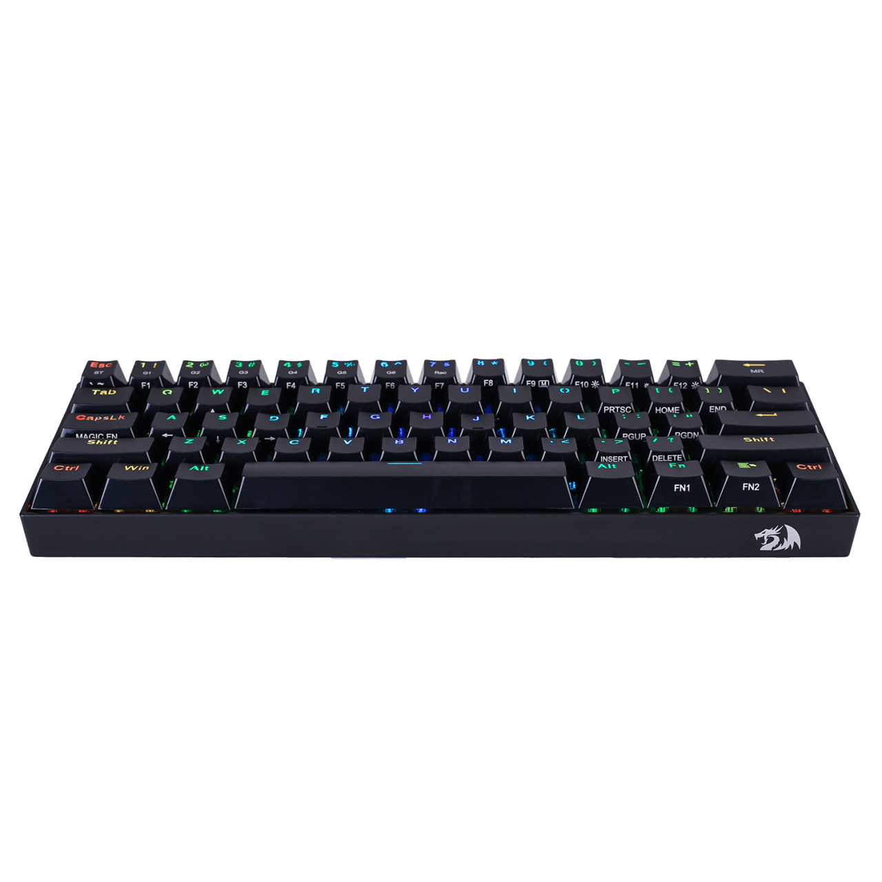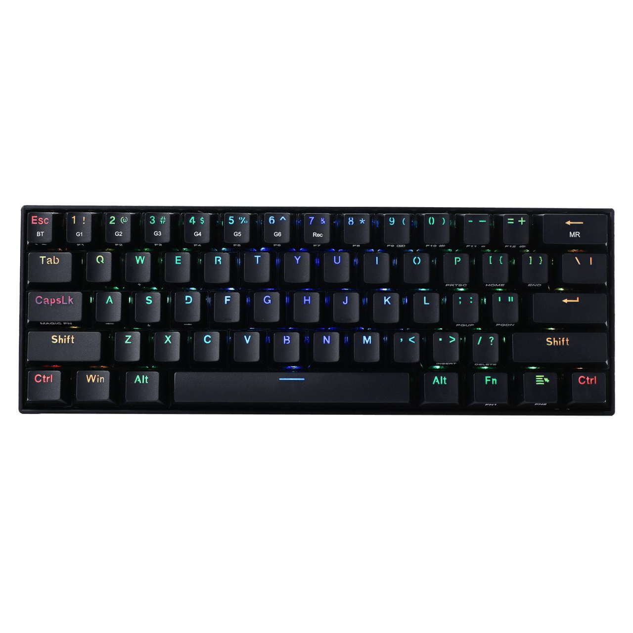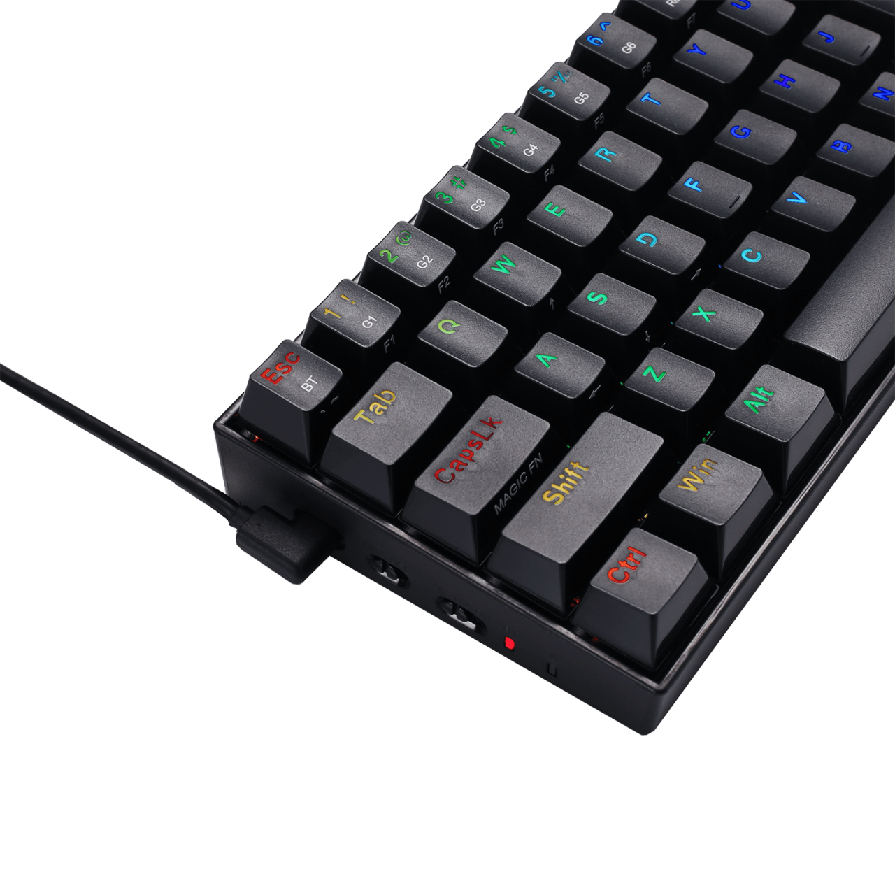 Tastatura Bluetooth si cu fir gaming mecanica Redragon Draconic neagra iluminare RGB, switch-uri Outemu maro, 4 switch-uri de schimb, protocol bluetooth: 5.0, se pot conecta 3 device-uri simultan (se selecteaza device-ul pe care il folositi din switch-ul de pe laterala tastaturii), baterie: 240mAh, toate tastele fara conflict - 61 taste (n-key rollover), iluminare LED RGB a tastelor (13 moduri de iluminare, reglarea intensitatii), functie de inregistrare macro on-the-fly, tasta WIN poate fi dezactivata in timpul jocurilor, conector USB Type-C placat cu aur, USB, dimensiuni: 292x102x36mm, greutate: 0.8kg