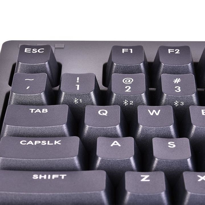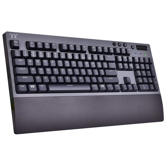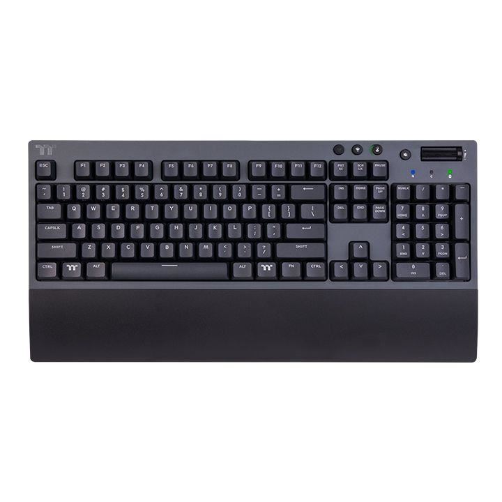 Tastatura Bluetooth wireless si cu fir gaming mecanica Thermaltake W1 Cherry MX Red neagra, tastatura mecanica, switch-uri mecanice rosii Cherry MX Red, garantate pentru 50 milioane de apasari, actuation point: 1.9 ± 0.6mm, key stroke: 3.7 – 0.4mm, actuation force: 45g, Bluetooth 4.2, se pot conecta 3 device-uri simultan (se selecteaza device-ul pe care il folositi din combinatia de butoane Fn si 1, 2 sau 3), polling rate de pana la 1000Hz (1000 HZ cu conectivitate 2.4GHz sau USB si 125 HZ cu conectivitate Bluetooth), 100% anti ghosting N key rollover pe USB, 10 KEY Rollover cu conectivitate 2.4GHz, 6 KEY Rollover cu conectivitate Bluetooth, butoane dedicate multimedia, utilizeaza 2 baterii de 1.5V AA, autonomie: Bluetooth 4.2 : aproximativ 2.5 luni sau 2.4GHz : aproximativ 1.5 luni, lungime cablu: 1.5m, dimensiuni:442 x 222 x 40.6 mm, greutate: 1.97kg