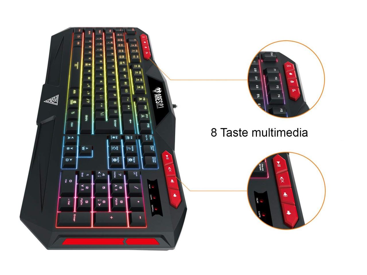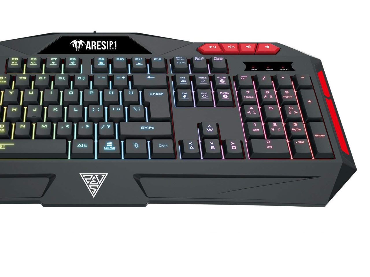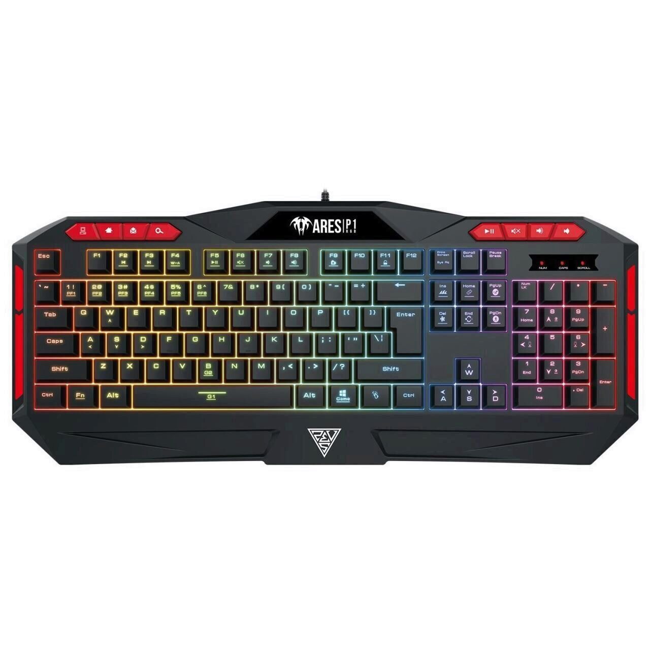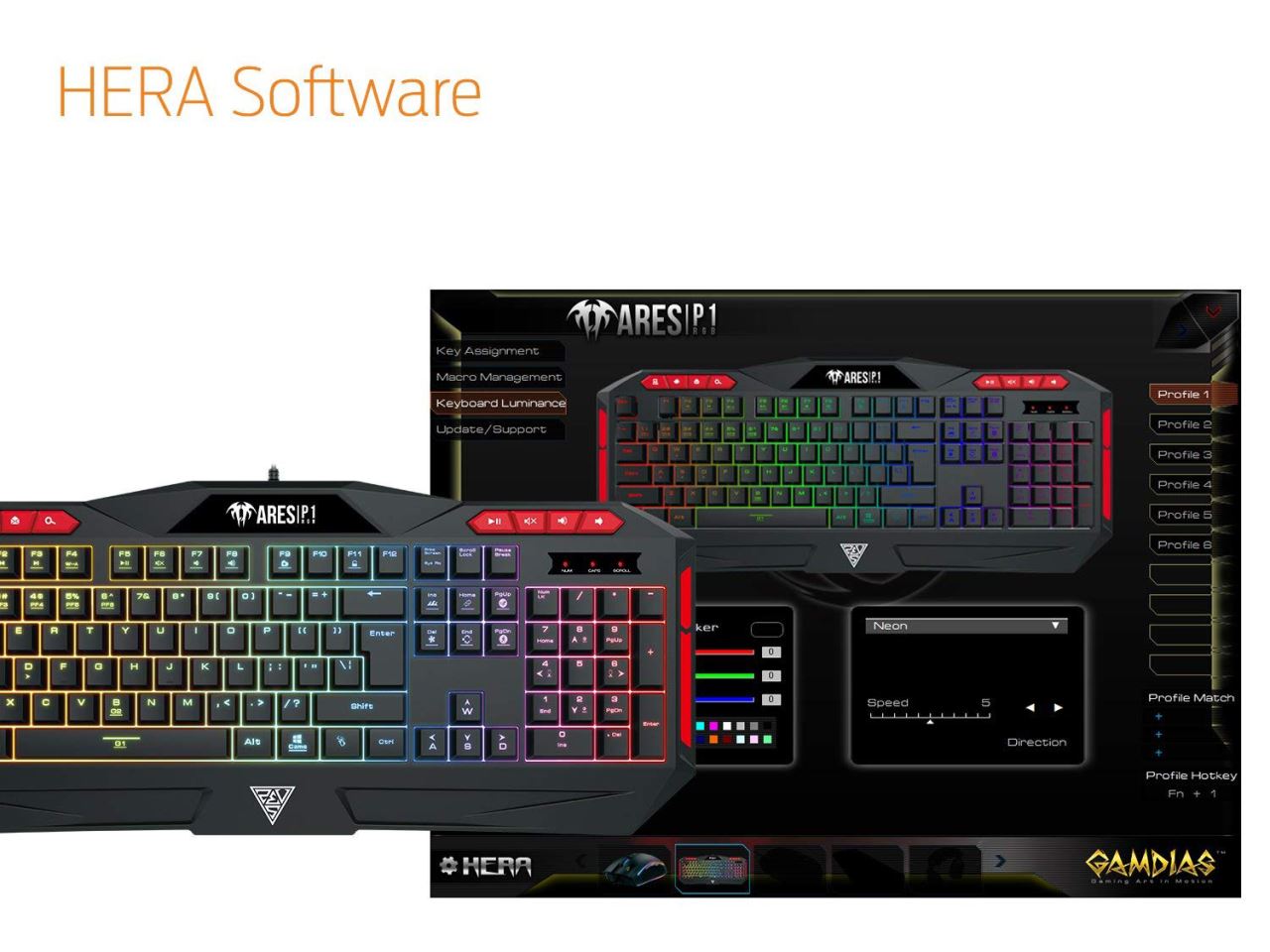 Gamdias Ares P1 RGB Keyboard, specificatii tastatura ARES P1 RGB: iluminare LED RGB pe 6 zone si 4 nivele de intensitate luminoasa, taste anti-ghosting, 26 de taste fara conflict (26-key rollover), 8 taste multimedia, polling rate: 1000Hz, mod schimbare WASD/Taste directionale, personalizare si configurare cu ajutorul programului GAMDIAS HERA, memorie on-board: 72KB, lungime cablu imbracat in textil: 1.8m, dimensiuni: 470x220x45mm, greutate: 710g