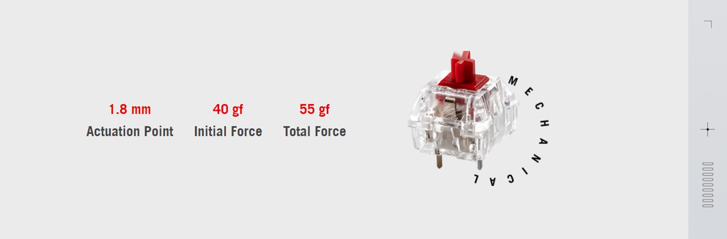 Comutatoarele mecanice ROG NX Red oferă un punct de acționare de 1,8 mm pentru o introducere rapidă a datelor. O acționare inițială de 40 de grame-forță (gf) ajută la prevenirea apăsării accidentale a tastelor și se extinde până la 55 gf pentru un feedback de revenire perfect. Ca urmare, apăsarea tastelor este instantanee și are o senzație lină și liniară.