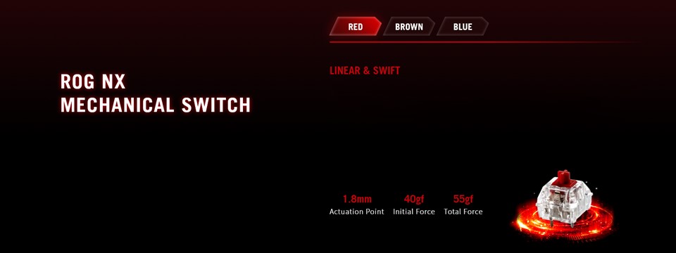 Comutatoarele mecanice ROG NX Red oferă un punct de acționare de 1,8 mm pentru o introducere rapidă. Forța inițială de 40 gf ajută la prevenirea apăsării accidentale a tastelor și se extinde până la 55 gf pentru un feedback de revenire perfect. Ca urmare, apăsarea tastelor este instantanee și are o senzație lină și liniară.