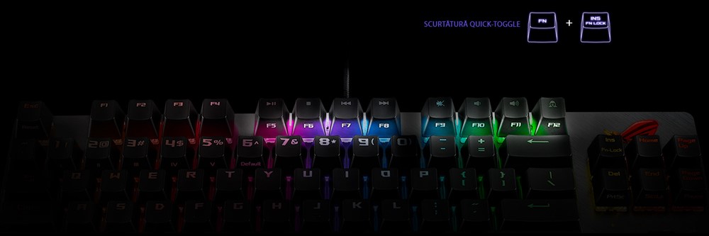 - Comutatoare de gaming exclusive ROG: Comutator mecanic ROG NX cu acționare rapidă și curbe de forță reglate de ROG pentru o senzație și un feedback excelent la apăsarea tastelor