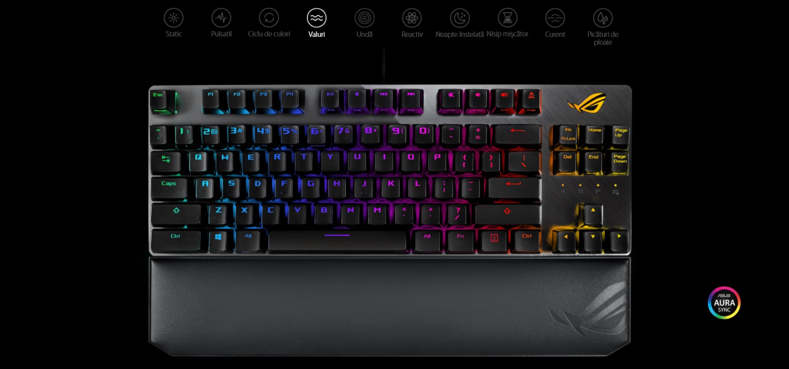 Notă: Sincronizarea iluminării între mouse-urile și tastaturile ROG este controlată prin intermediul Armoury Crate, în timp ce sincronizarea cu alte componente este activata prin intermediul softului ASUS Aura.