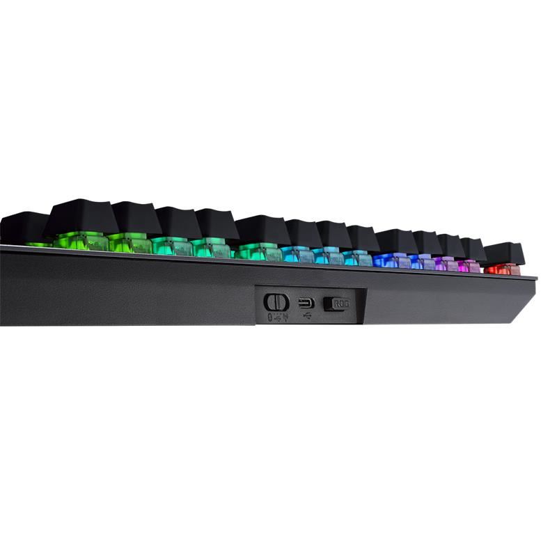 Tastatura gaming ASUS ROG Strix Scope NX TKL Deluxe ROG RX Red neagra, mod de conectare: fir / wireless 2.4GHz / Bluetooth (se poate conecta la 3 dispozitive Bluetooth simultan), tastatura mecanica cu switch-uri ROG RX Red (durata de viata: 100 milioane apasari), partea superioara este confectionata din aluminiu, iluminare RGB (16.8 milioane de culori disponibile) si diverse efecte de iluminare (10 efecte predefinite, compatibilia cu Asus Aura Sync), taste anti-ghosting, toate tastele fara conflict (n-key rollover), , posibilitatea inregistrarii macro-urilor On-The-Fly, 7 taste multimedia, 1 tasta privacy(prin apasarea tastei F12, toate aplicatiile sunt minimizate iar sunetul este oprit, apasarea inca o data a tastei restaureaza aplicatiile si sonorul), autonomie: pana la 76 de ore in mod wireless 2.4Ghz, personalizare si configurare cu ajutorul programului Asus Armoury, lungime cablu: 1.8m, dongle USB 2.4GHz placat cu aur, dimensiuni: 356x136x39 mm, greutate: 0.86kg