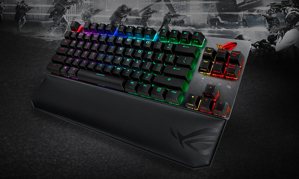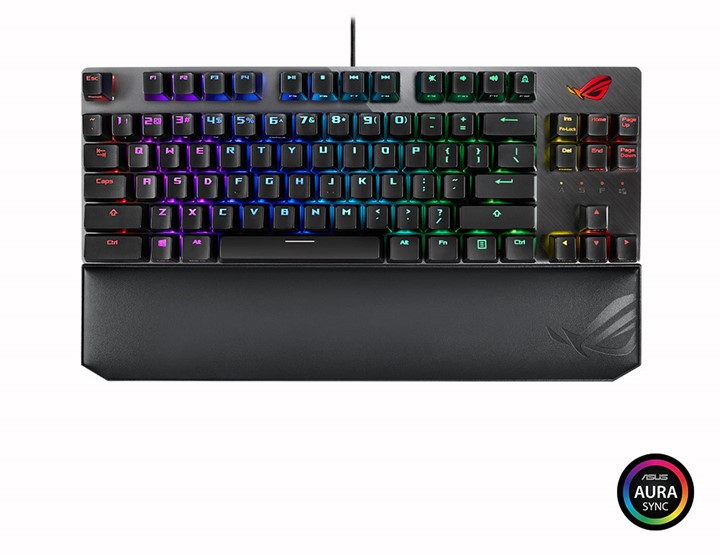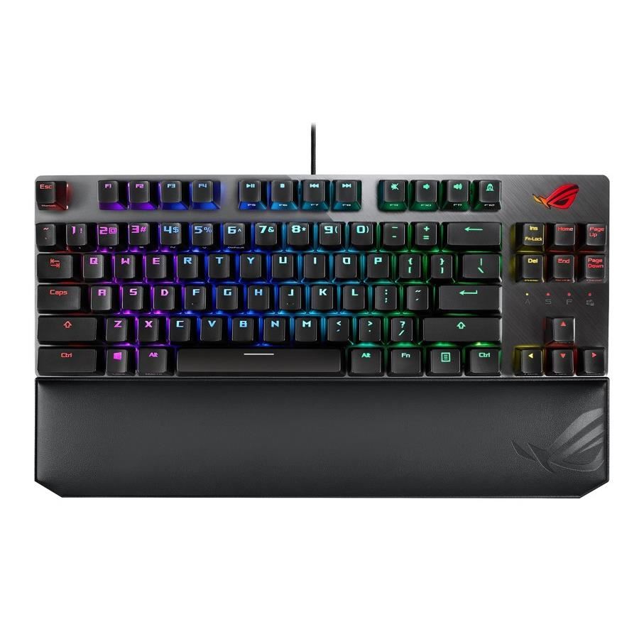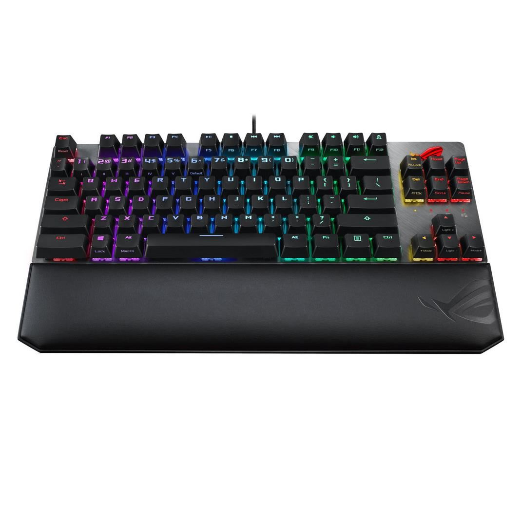 Tastatură Gaming ASUS ROG Strix Scope TKL Deluxe, RGB, switch-uri Cherry MX, cadru din aluminiu, suport ergonomic pentru încheietură, iluminare Aura Sync