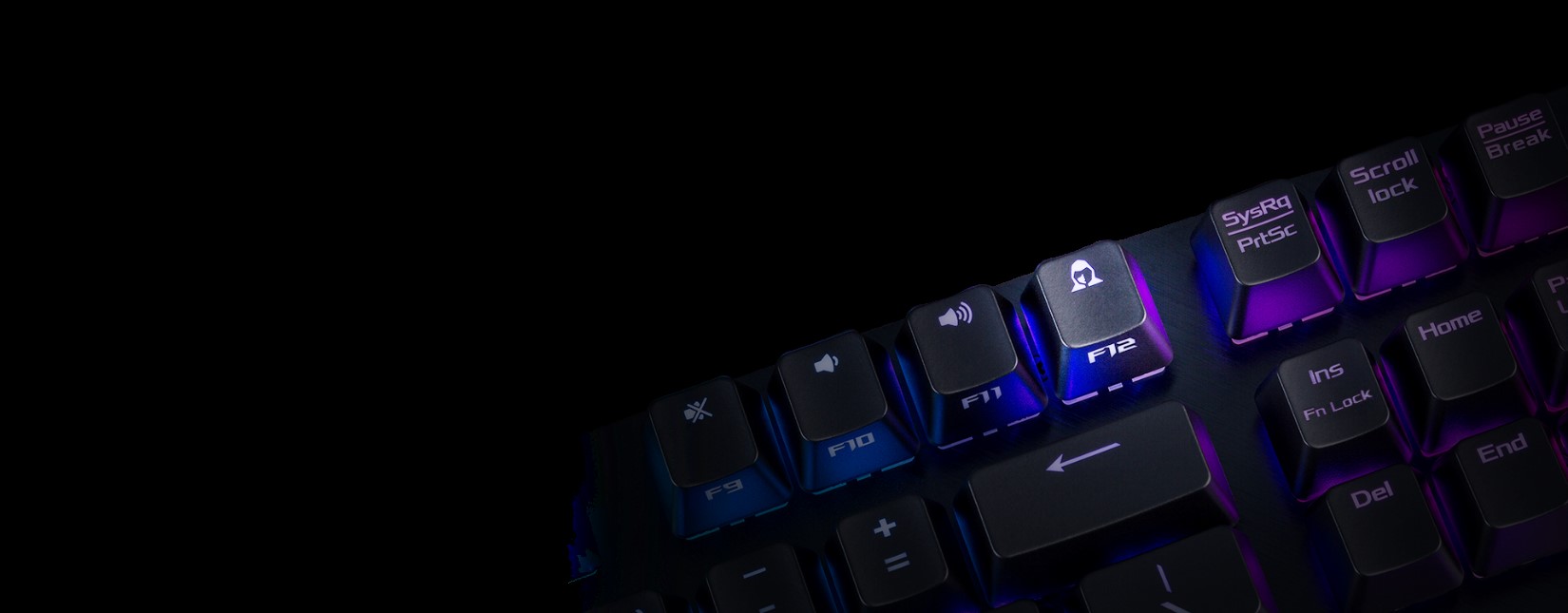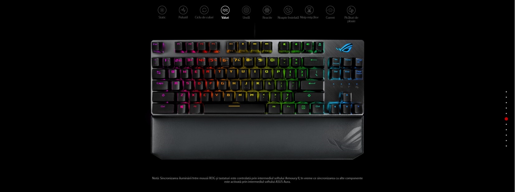 Iluminarea vibrantă pe fiecare tastă oferă strălucire pe toată suprafața tastaturii. Susținute de Aura Sync, întregul spectru coloristic și efectele luminoase dinamice sunt la dispoziția dvs. pentru a crea o tastatură unică. Iluminarea este ușor de sincronizat cu ecosistemul extins Aura pentru a crea un mediu de gaming care strălucește cu adevărat.