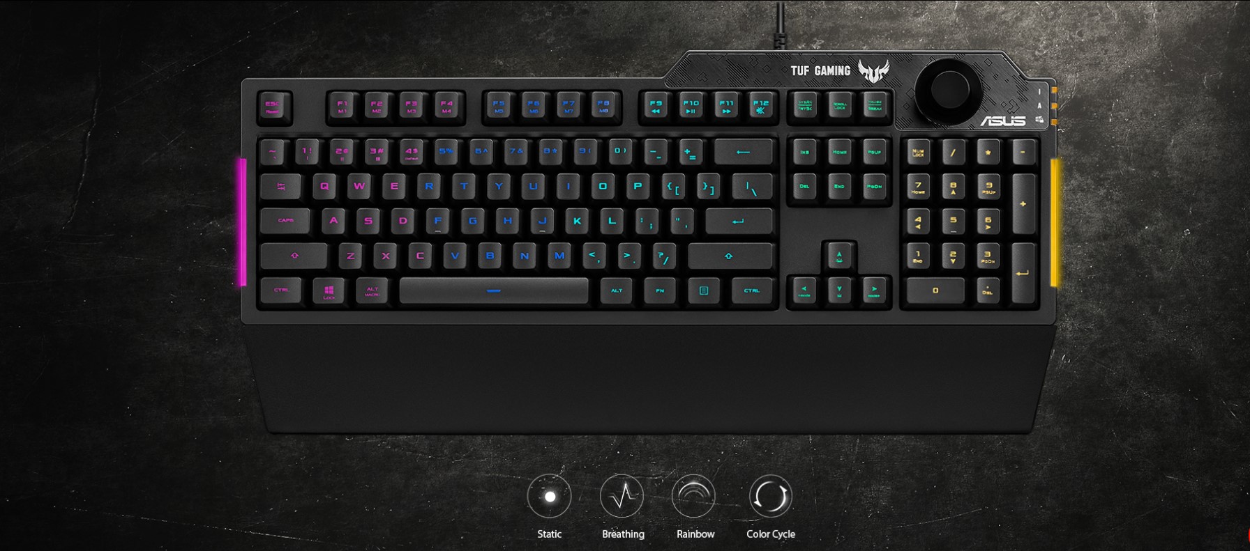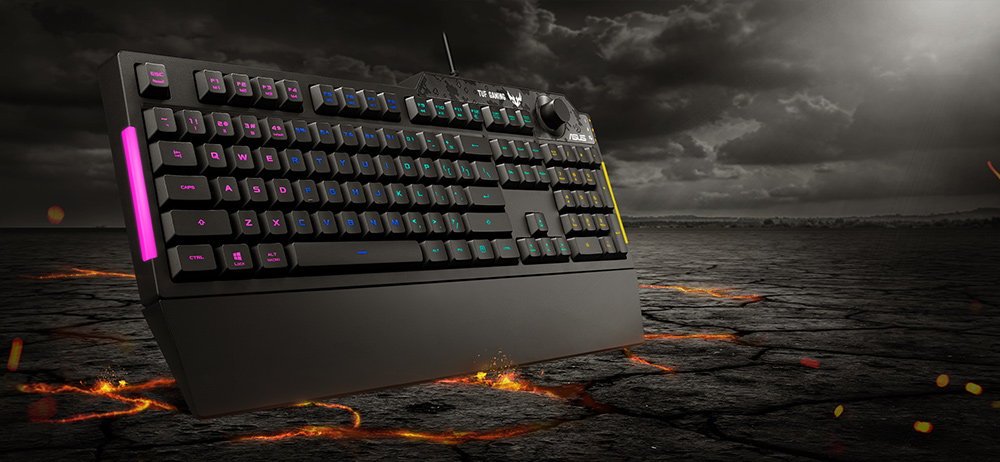 Tastatura Gaming ASUS TUF Gaming K1, RGB, rezistenta la varsarile accidentale de lichide, buton dedicat pentru volum, bara laterala iluminata si Armory Crate