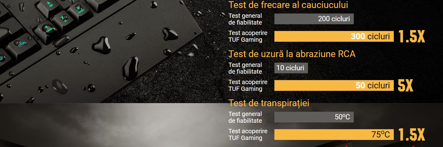 Atat in interior cat si in exterior, TUF Gaming K1 este construita pentru a oferi ani de serviciu in prima linie. Invelisul sau exterior prezinta o acoperire speciala, intarita pentru a rezista la o serie de peste 10 teste stricte de abraziune, frecare si transpiratie. Si rezistenta la varsare de pana la 300 ml te asigura ca accidentele cu cani sau cutii nu vor intrerupe actiunea.