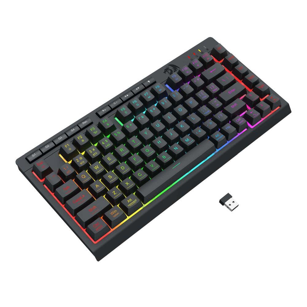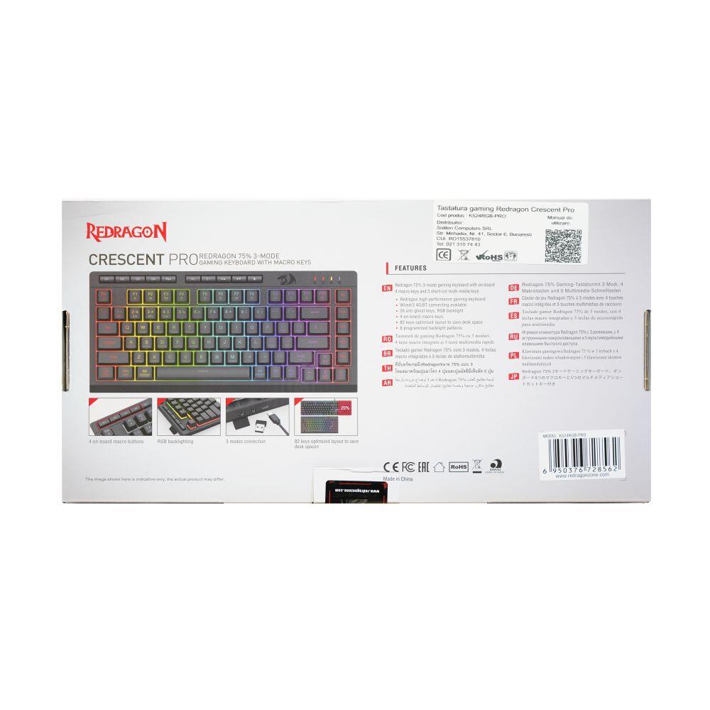 Tastatura gaming Bluetooth cu fir si wireless Redragon Crescent Pro neagra iluminare RGB, 82 de taste, 26 taste fara conflict (26-key rollover), iluminare LED RGB a tastelor, protocol bluetooth: 5.0, se pot conecta 3 device-uri simultan (se selecteaza device-ul pe care il folositi din combinatia de taste FN si 1,2,si 3), protocol wireless 2.4 Ghz, 5 taste multimedia, 4 taste MACRO, tasta WIN poate fi dezactivata in timpul jocurilor, soft de configurare al tastaturii, conector USB, dimensiuni: 326x156x38mm, greutate: 0.57kg