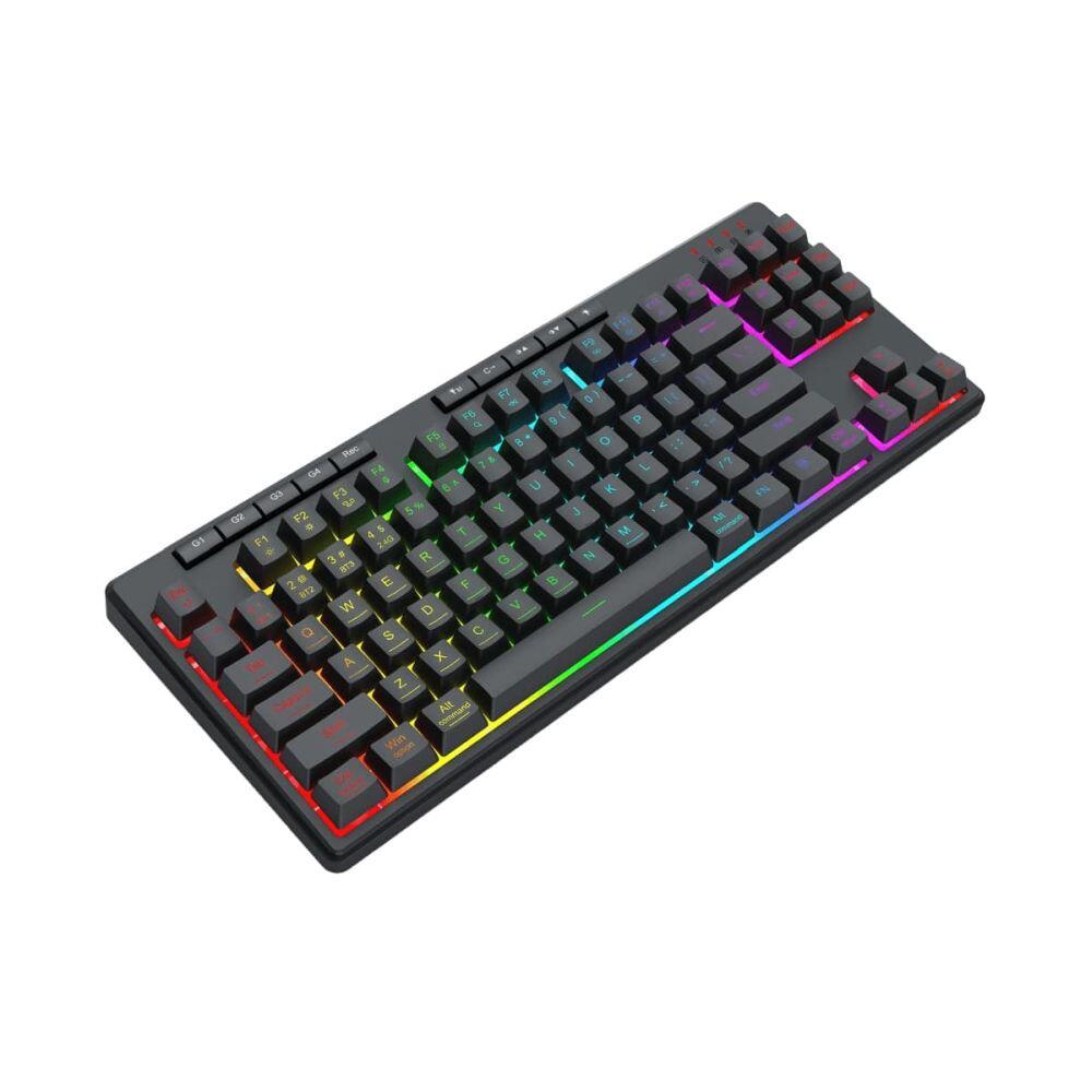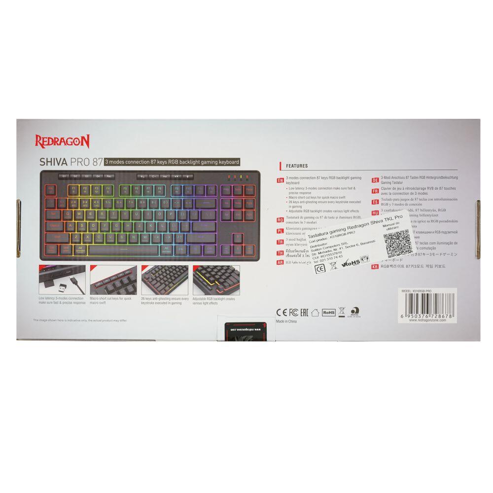 Tastatura gaming Bluetooth cu fir si wireless Redragon Shiva TKL Pro neagra iluminare RGB, 87 de taste, 26 taste fara conflict (26-key rollover), iluminare LED RGB a tastelor, protocol bluetooth: 5.0, se pot conecta 3 device-uri simultan (se selecteaza device-ul pe care il folositi din combinatia de taste FN si 1,2,si 3), protocol wireless 2.4 Ghz, 5 taste multimedia, 4 taste MACRO, tasta WIN poate fi dezactivata in timpul jocurilor, soft de configurare al tastaturii, conector USB, dimensiuni: 365x150x40mm, greutate: 0.7kg