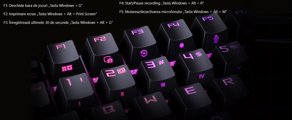 Tastele F1-F5 ale seriei ROG Strix Scope II au fost mapate ca taste rapide pentru Xbox Game Bar și pentru funcțiile de înregistrare.
