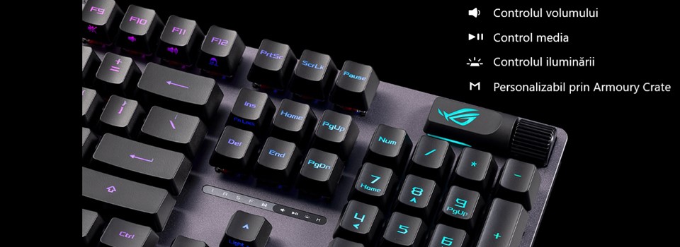 - Capace de taste din PBT: Capacele de taste ROG PBT durabile cu dublă injecție oferă o senzație premium și rezistență la lustruire*