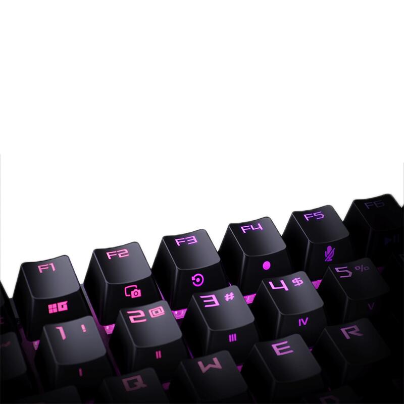 Capacele de taste ROG PBT cu dublă injecție oferă o senzație unică și premium, precum și rezistență de lungă durată. Designul tastelor a fost optimizat cu capace de taste de înălțime medie (similar cu cele cu profil Cherry) și o tijă mai scurtă pentru a reduce oscilația tastelor și pentru a oferi o experiență de utilizare mai confortabilă.