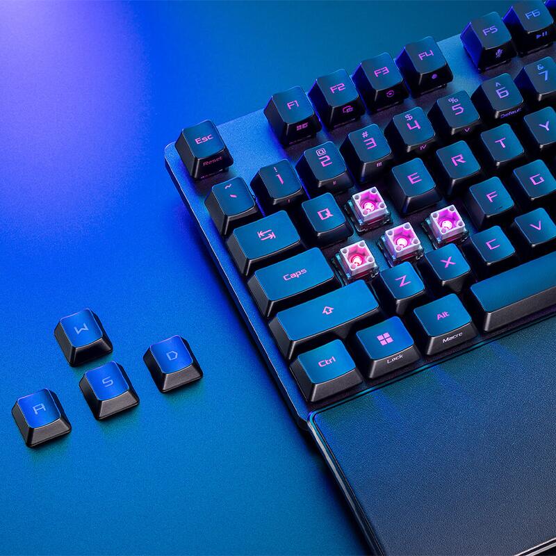Capacele de taste ROG PBT cu dublă injecție oferă o senzație unică și premium, precum și rezistență de lungă durată. Designul tastelor a fost optimizat cu capace de taste de înălțime medie (similar cu cele cu profil Cherry) și o tijă mai scurtă pentru a reduce oscilația tastelor și pentru a oferi o experiență de utilizare mai confortabilă.
