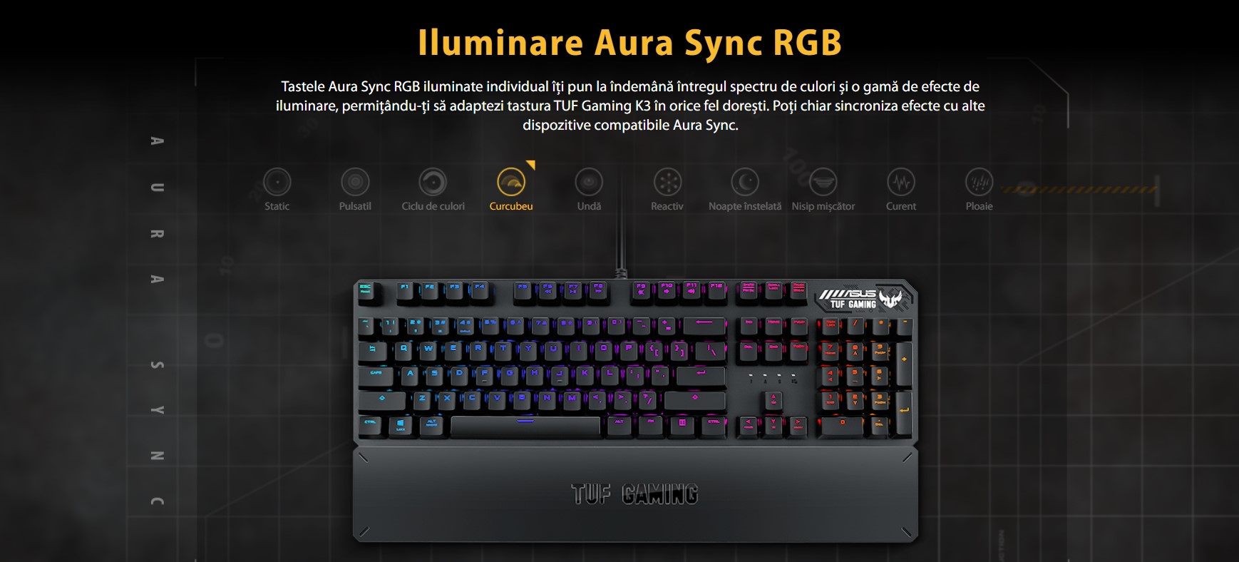 Tastatura Gaming ASUS TUF Gaming K3, RGB, switch-uri mecanice durabile cu rollover N-Key, combinatie de taste media, passthrough USB 2.0, 8 butoane macro programabile, suprafata din aluminiu, iluminare Aura Sync