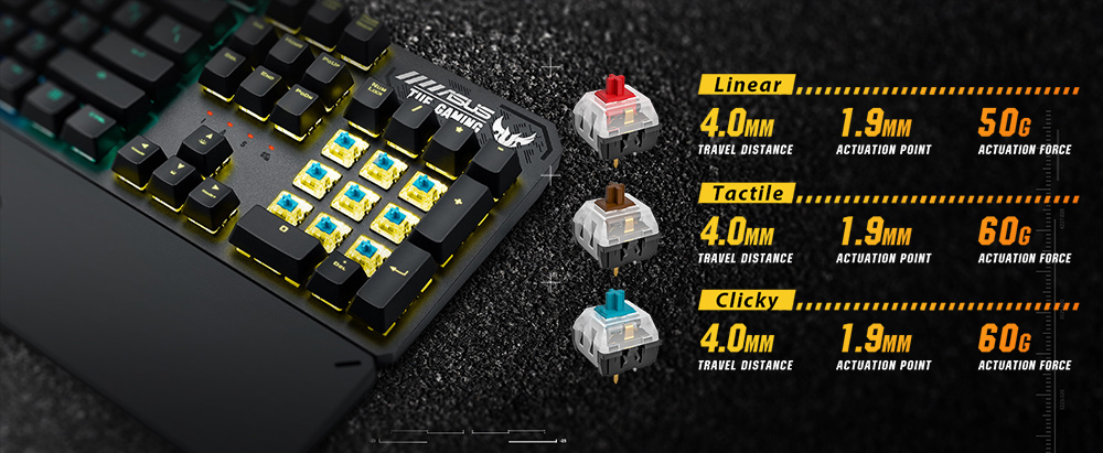 TUF Gaming K3 are switch-uri mecanice foarte durabile, cu o durata de viata de 50 milioane de apasari si este oferita in varianta de switch-uri Rosu. Tehnologia anti-ghosting 100% si rollover n-key (NKRO) asigura inregistrarea fiecarei apasari de taste, astfel incat o sa ai intotdeauna incredere in comanda.