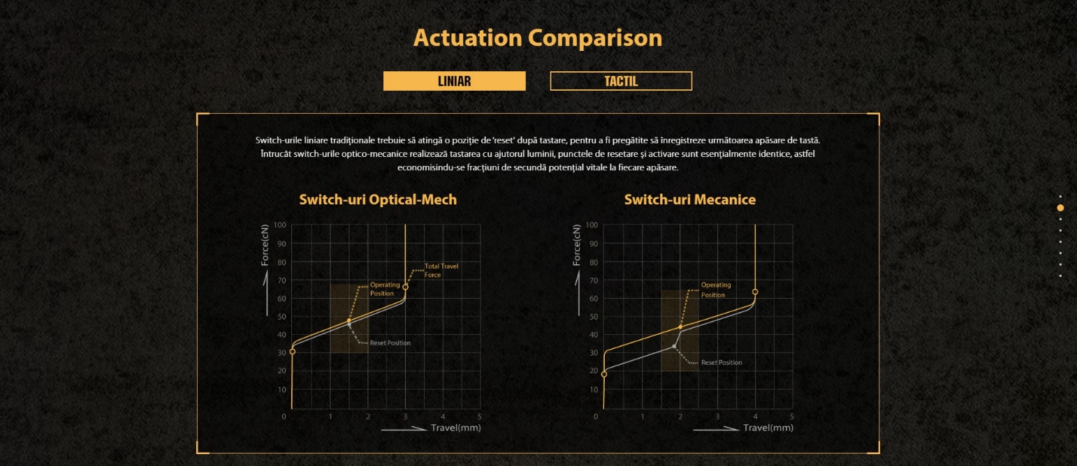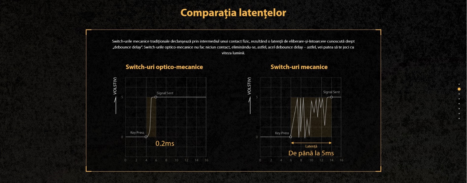 - Proiectată pe baza unor inovatoare switch-uri optico-mecanice, pentru o declanșare precisă care este de 25 de ori mai rapidă decât a unei tastaturi mecanice standard, vine cu switch-uri atât tactile, cât și liniare.