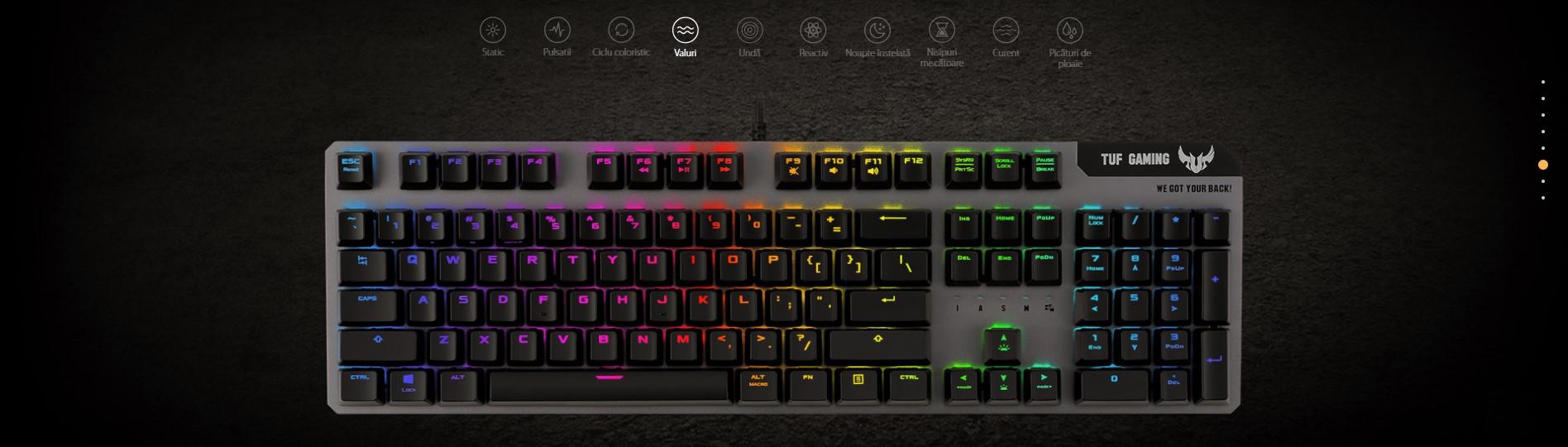 Cu Aura Sync, întregul spectru de culoare și o gamă de efecte de iluminare dinamice sunt la dispoziția ta, pentru a-ți putea crea o tastatură unică, personalizată pentru tine, cu ajutorul LED-urilor controlabile individual ale fiecărei taste. Iluminarea RGB a lui TUF Gaming K7 se poate sincroniza, de asemenea, cu ușurință cu întregul ecosistem extins Aura, pentru a-ți crea un mediu de joc care strălucește cu adevărat.