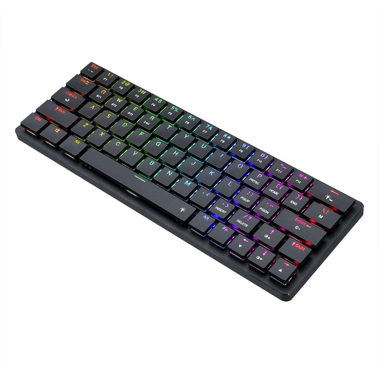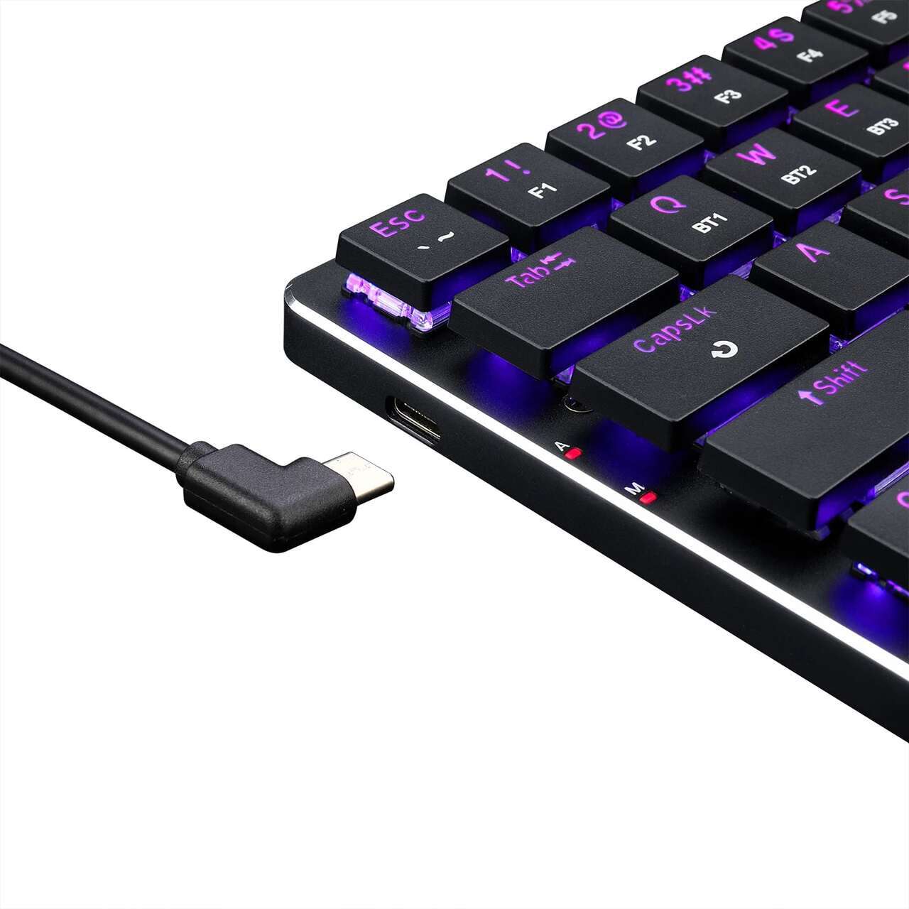 Tastatura gaming mecanica Bluetooth cu fir si wireless Redragon Elise Pro RGB neagra, toate tastele fara conflict - 63 taste (n-key rollover), switch-uri low profile albastre Redragon (durata de viata: 50 de milioane de apasari), protocol bluetooth: 5.0, se pot conecta 3 device-uri simultan (se selecteaza device-ul pe care il folositi din combinatia de taste FN si Q, W,si E), baterie: 1600mAh, protocol wireless 2.4 Ghz, iluminare LED RGB a tastelor (16 milioane de culori disponibile, 20 moduri de iluminare, reglarea intensitatii), tasta WIN poate fi dezactivata in timpul jocurilor, caracterele de pe taste nu se sterg datorita constructiei prin injectie dubla de plastic (double shot injection keycaps), cablu detasabil, dongle USB, dimensiuni: 294x104x23mm, greutate: 409g