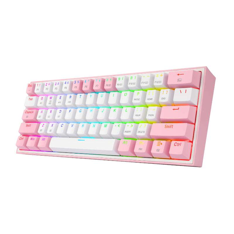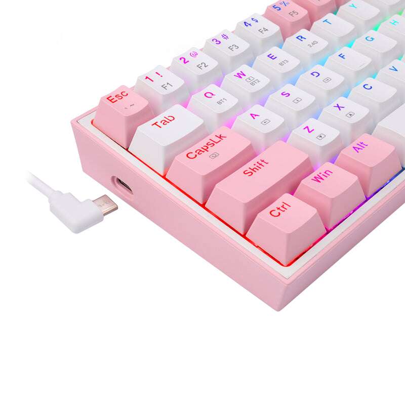 Tastatura gaming mecanica Bluetooth cu fir si wireless Redragon Fizz Pro alba cu roz iluminare RGB switch-uri rosii, toate tastele fara conflict, 61 taste (n-key rollover), switch-uri rosii Redragon (durata de viata: 50 de milioane de apasari), 4 switch-uri rosii de schimb, protocol bluetooth: 5.0, se pot conecta 3 device-uri simultan (se selecteaza device-ul pe care il folositi din combinatia de taste FN si Q, W,si E), baterie: 1600mAh, protocol wireless 2.4 Ghz, iluminare LED RGB a tastelor (posibilitatea reglarea intensitatii luminoase, 13 moduri de iluminare), tasta WIN poate fi dezactivata in timpul jocurilor, caracterele de pe taste nu se sterg datorita constructiei prin injectie dubla de plastic (double shot injection keycaps), cablu detasabil, conector USB Type-C, dongle wireless USB, dimensiuni: 296x105x45mm, greutate: 459g