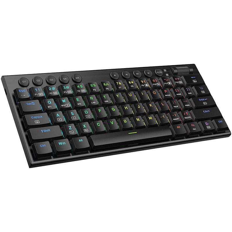 Tastatura gaming mecanica Bluetooth cu fir si wireless Redragon Horus Mini PRO neagra iluminare RGB, format 60%, sasiu din metal, toate tastele fara conflict, switch-uri rosii Redragon (durata de viata: 50 de milioane de apasari), taste low profile, 4 switch-uri de schimb, iluminare LED RGB a tastelor (posibilitatea reglarea intensitatii luminoase, 21 moduri de iluminare), 4 butoane MACRO, 5 taste multimedia, protocol bluetooth: 5.0, se pot conecta 3 device-uri simultan (se selecteaza device-ul pe care il folositi din combinatia de taste FN si 1, 2, 3), acumulator: 1600mAh, protocol wireless 2.4 Ghz, tasta WIN poate fi dezactivata in timpul jocurilor, soft pentru configurare, caracterele de pe taste nu se sterg datorita constructiei prin injectie dubla de plastic (double shot injection keycaps), cablu detasabil, conector USB Type-C, dimensiuni: 295x125x23mm, greutate: 409g