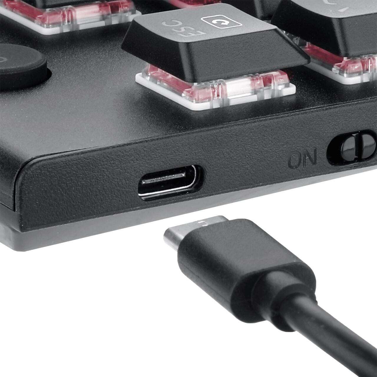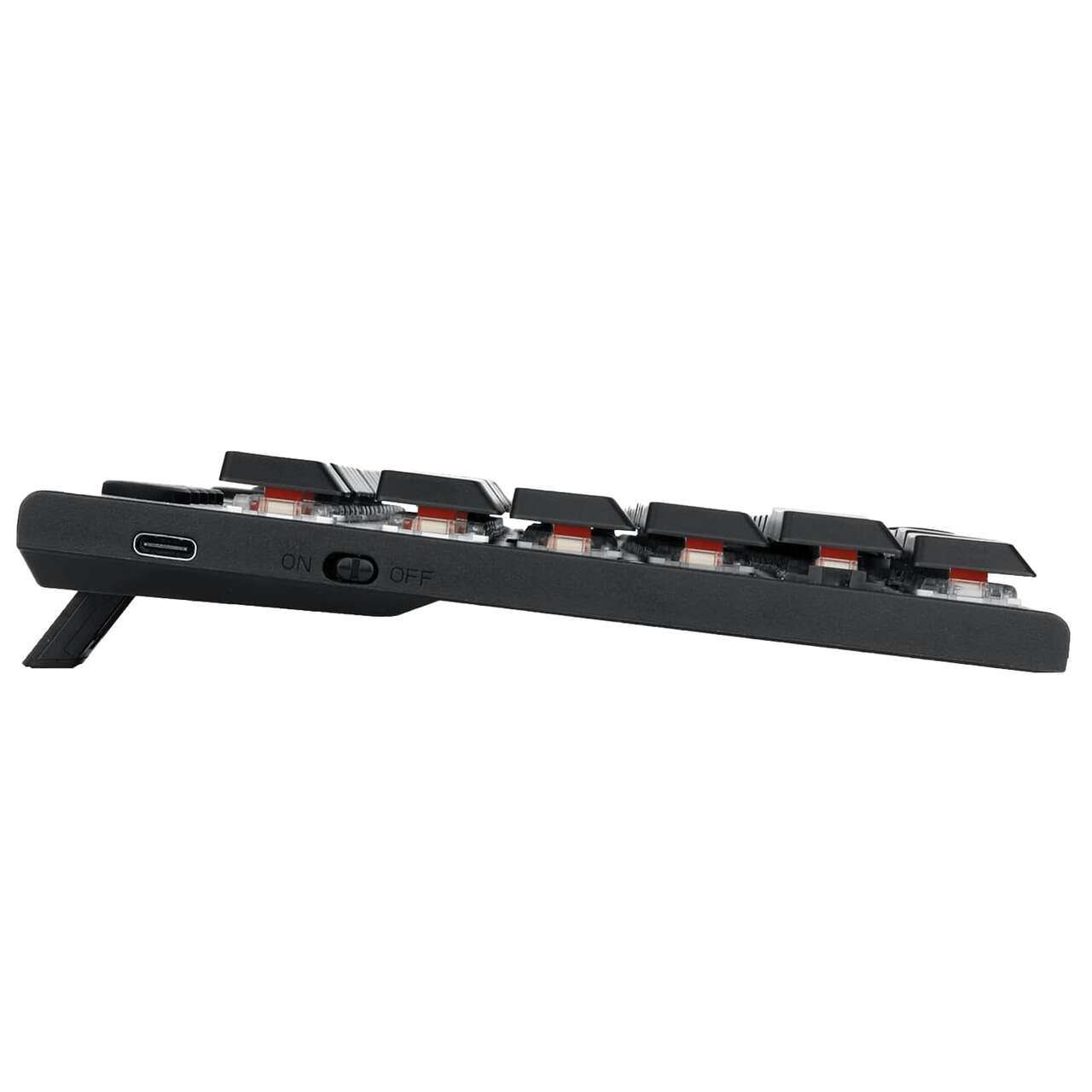 Tastatura gaming mecanica Bluetooth cu fir si wireless Redragon Horus neagra iluminare RGB switch-uri rosii, sasiu din metal, toate tastele fara conflict, switch-uri rosii Redragon (durata de viata: 50 de milioane de apasari), 8 switch-uri de schimb, protocol bluetooth: 5.0, se pot conecta 3 device-uri simultan (se selecteaza device-ul pe care il folositi din combinatia de taste FN si 1,2,si 3), baterie: 1900mAh, protocol wireless 2.4 Ghz, iluminare LED RGB a tastelor (posibilitatea reglarea intensitatii luminoase, 21 moduri de iluminare), logo iluminat RGB, tasta WIN poate fi dezactivata in timpul jocurilor, soft pentru configurare, caracterele de pe taste nu se sterg datorita constructiei prin injectie dubla de plastic (double shot injection keycaps), cablu detasabil, conector USB Type-C, dongle wireless USB, dimensiuni: 438x148x22mm, greutate: 721g