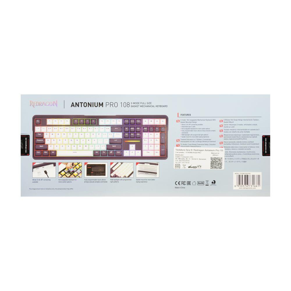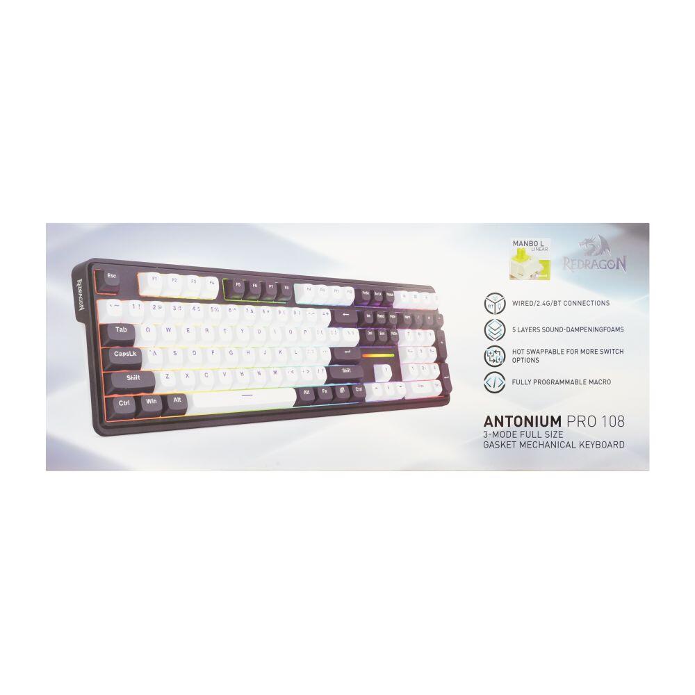 Tastatura gaming mecanica Bluetooth cu si fara fir Redragon Antonium Pro 108 neagra cu alb iluminare RGB, switch-uri liniare Redragon Mambo L, keycaps-uri din PBT, toate tastele fara conflict – 108 taste (n-key rollover), protocol bluetooth: 5.0, se pot conecta 3 device-uri simultan (se selecteaza device-ul pe care il folositi din switch-ul de pa spatele tastaturii), baterie: 4000mAh, protocol wireless 2.4 Ghz, garnituri din silicon si spuma EVA, iluminare LED RGB a tastelor (20 moduri de iluminare, reglarea intensitatii), tasta WIN poate fi dezactivata in timpul jocurilor, posibilitate inregistrare MACRO-uri pe orice tasta, compatibila MAC, suporta layout MAC (se shimba din switch-ul de pe spatele tastaturii), compatibila cu majoritatea switch-urilor, conector USB Type-C, cablu USB detasabil, dimensiuni: 445x142x38mm, greutate: 1.06Kg