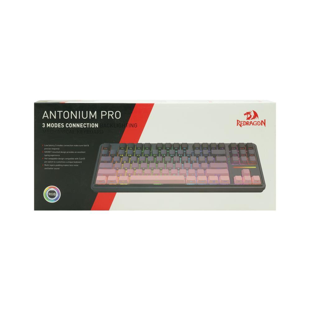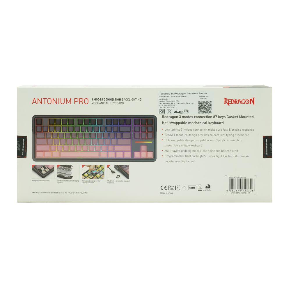 Tastatura gaming mecanica Bluetooth cu si fara fir Redragon Antonium Pro neagra cu roz iluminare RGB, switch-uri liniare Huano, keycaps-uri din PBT, toate tastele fara conflict – 87 taste (n-key rollover), protocol bluetooth: 5.0, se pot conecta 3 device-uri simultan (se selecteaza device-ul pe care il folositi din swith-ul de pa laterala tastaturii), baterie: 3000mAh, protocol wireless 2.4 Ghz, garnituri din silicon si spuma EVA, iluminare LED RGB a tastelor (20 moduri de iluminare, reglarea intensitatii), tasta WIN poate fi dezactivata in timpul jocurilor, posibilitate inregistrare MACRO-uri pe orice tasta, compatibila MAC, suporta layout MAC (se shimba din combinatia de taste FN + W sau A), compatibila cu majoritatea switch-urilor, conector USB Type-C, cablu USB detasabil, dimensiuni: 373x140x37mm, greutate: 0.98Kg
