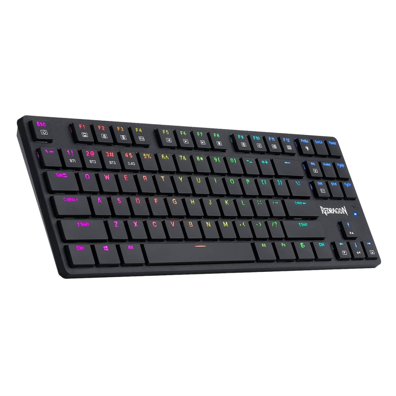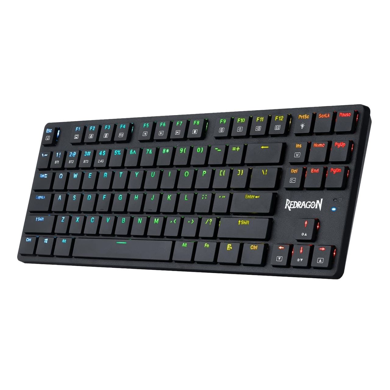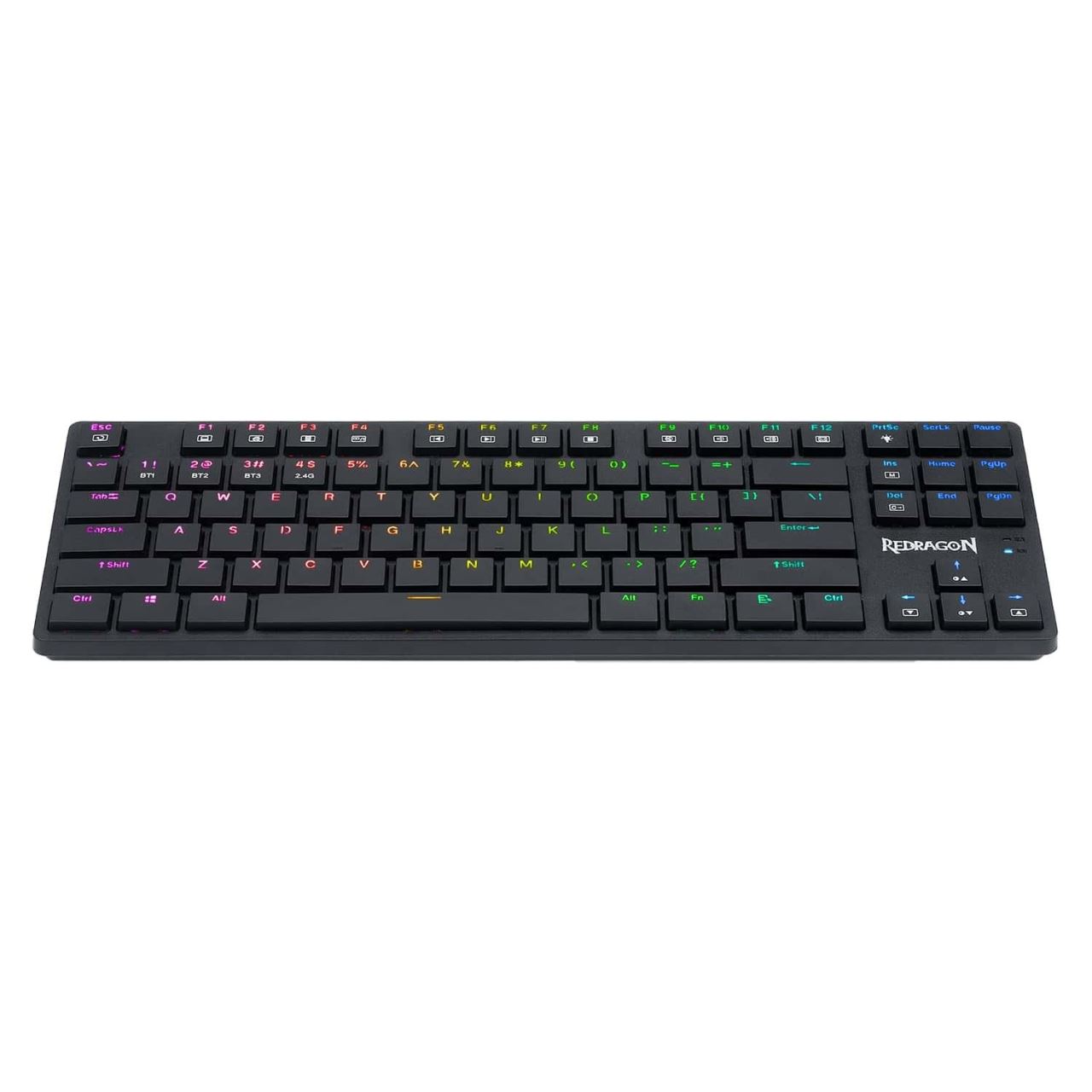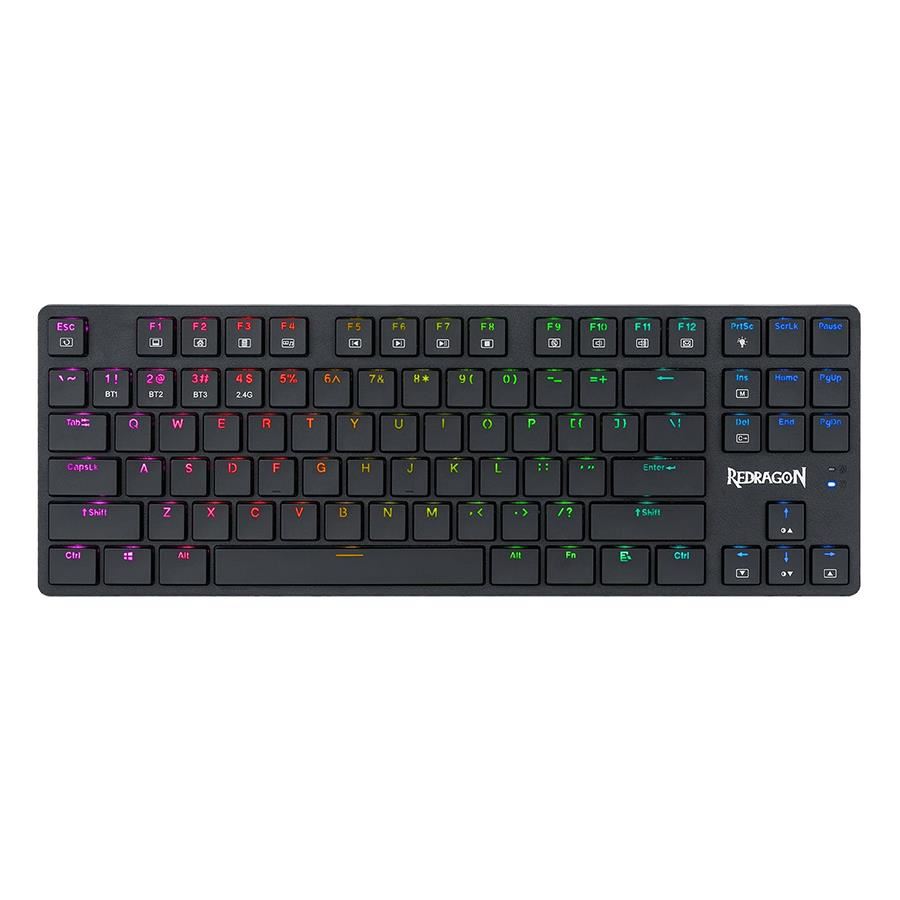 Tastatura gaming mecanica Bluetooth cu si fara fir Redragon Anubis neagra iluminare RGB switch-uri maro, toate tastele fara conflict, taste low profile, switch-uri maro Redragon (durata de viata: 50 de milioane de apasari), include switch-uri de schimb, protocol bluetooth: 5.0, se pot conecta 3 device-uri simultan (se selecteaza device-ul pe care il folositi combinatia de taste “FN”si tastele de la 1 la 3), baterie: 1900mAh, protocol wireless 2.4 Ghz, iluminare LED RGB a tastelor (posibilitatea reglarea intensitatii luminoase, 20 moduri de iluminare), logo iluminat RGB, tasta WIN poate fi dezactivata in timpul jocurilor, soft pentru configurare, caracterele de pe taste nu se sterg datorita constructiei prin injectie dubla de plastic (double shot injection keycaps), cablu detasabil imbracat in textil, conector USB Type-C, dongle wireless USB, dimensiuni: 356x126x19mm, greutate: 525g