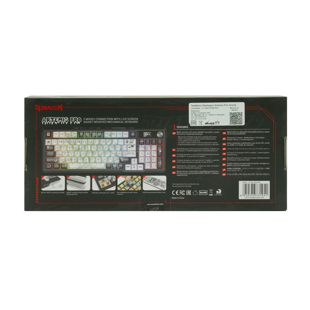 Tastatura gaming mecanica Bluetooth cu si fara fir Redragon Artemis Pro Anime neagra cu alb iluminare RGB, switch-uri liniare Redragon galbene, keycaps-uri din PBT, toate tastele fara conflict – 95 taste (n-key rollover), protocol bluetooth: 5.0, se pot conecta 3 device-uri simultan (se selecteaza device-ul pe care il folositi din swith-ul de pa laterala tastaturii), baterie: 4000mAh, protocol wireless 2.4 Ghz, iluminare LED RGB a tastelor (20 moduri de iluminare, reglarea intensitatii), display oLED 1.41 inch customizabil, gasket din silicon si spuma PO de 3.5mm, tasta WIN poate fi dezactivata in timpul jocurilor, posibilitate inregistrare MACRO-uri pe orice tasta, compatibila cu majoritatea switch-urilor, conector USB Type-C, cablu USB detasabil, dimensiuni: 394x144x39mm, greutate: 830g