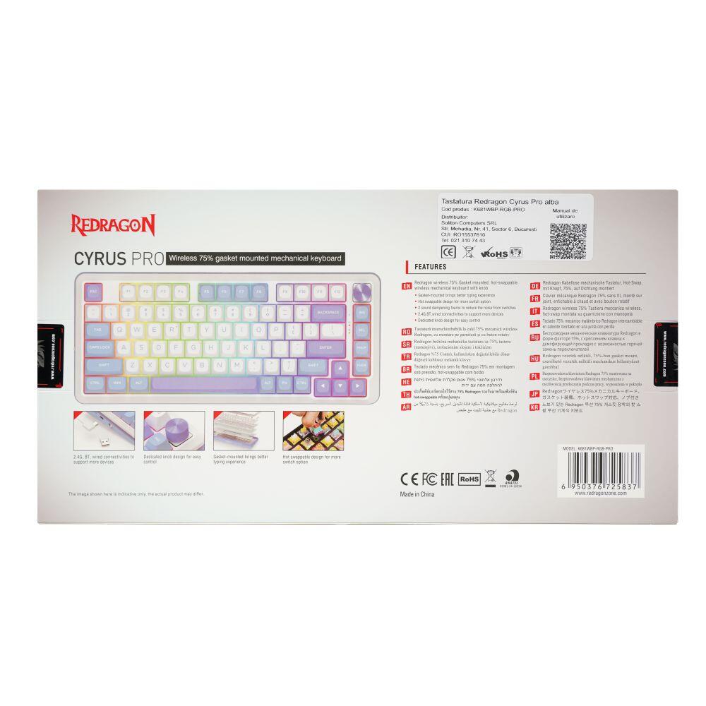 Tastatura gaming mecanica Bluetooth cu si fara fir Redragon Cyrus Pro alba cu mov iluminare RGB, sasiu din plastic, switch-uri liniare Redragon gri, keycaps-uri din PBT, toate tastele fara conflict – 81 taste (n-key rollover), protocol bluetooth: 5.0, se pot conecta 3 device-uri simultan (se selecteaza device-ul pe care il folositi din swith-ul de pa laterala tastaturii), baterie: 4000mAh, protocol wireless 2.4 Ghz. iluminare LED RGB a tastelor (20 moduri de iluminare, reglarea intensitatii), rotita pentru reglarea volumului, EVA Silencer Foam instalata in interiorul tastaturii, gasket din silicon, tasta WIN poate fi dezactivata in timpul jocurilor, include switch-uri de schimb, compatibila cu mojoritatea switch-urilor, conector USB Type-C, cablu USB detasabil (cablu cu conectori USB Type-C si adaptor pentru USB Type A), dimensiuni: 335x140x43mm, greutate: 858g