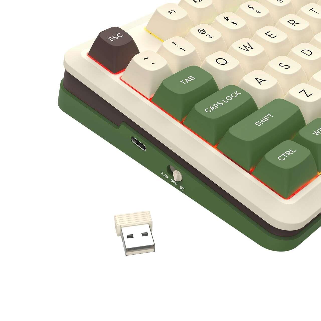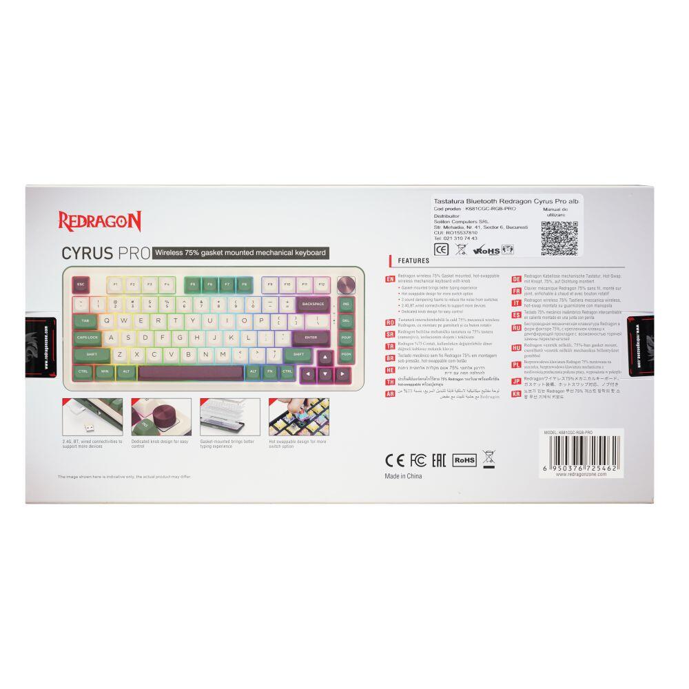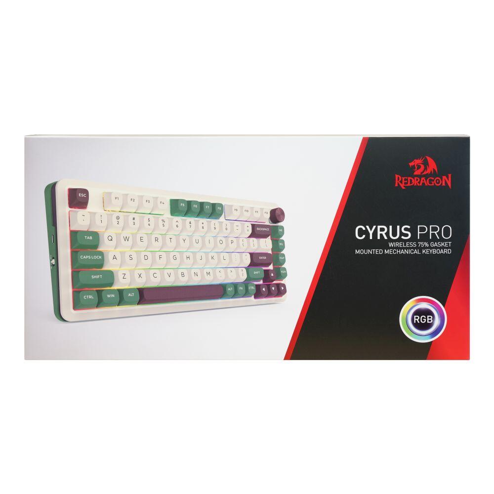 Tastatura gaming mecanica Bluetooth cu si fara fir Redragon Cyrus Pro alba cu verde iluminare RGB, sasiu din plastic, switch-uri Redragon roz, keycaps-uri din PBT, toate tastele fara conflict – 81 taste (n-key rollover), protocol bluetooth: 5.0, se pot conecta 3 device-uri simultan (se selecteaza device-ul pe care il folositi din swith-ul de pa laterala tastaturii), baterie: 4000mAh, protocol wireless 2.4 Ghz. iluminare LED RGB a tastelor (20 moduri de iluminare, reglarea intensitatii), rotita pentru reglarea volumului, EVA Silencer Foam instalata in interiorul tastaturii, gasket din silicon, tasta WIN poate fi dezactivata in timpul jocurilor, include switch-uri de schimb, compatibila cu mojoritatea switch-urilor, conector USB Type-C, cablu USB detasabil (cablu cu conectori USB Type-C si adaptor pentru USB Type A), dimensiuni: 335x140x43mm, greutate: 858g