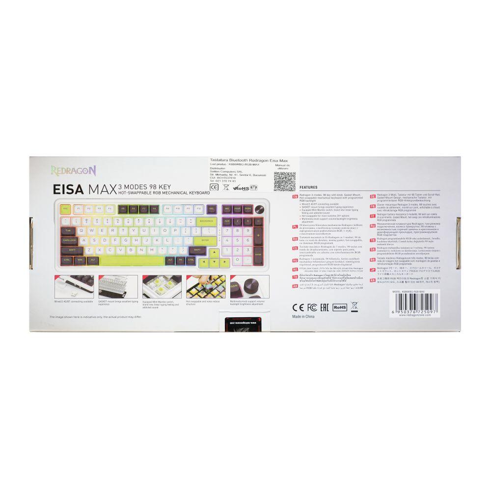 Tastatura gaming mecanica Bluetooth cu si fara fir Redragon Eisa Max alba cu verde iluminare RGB, sasiu din plastic, switch-uri Mint Mambo, keycaps-uri din PBT, toate tastele fara conflict – 98 taste (n-key rollover), protocol bluetooth: 5.0, se pot conecta 3 device-uri simultan (se selecteaza device-ul pe care il folositi din swith-ul de pa laterala tastaturii), baterie: 3000mAh, protocol wireless 2.4 Ghz. iluminare LED RGB a tastelor (20 moduri de iluminare, reglarea intensitatii), EVA Silencer Foam instalata in interiorul tastaturii, gasket din silicon, tasta WIN poate fi dezactivata in timpul jocurilor, compatibila cu majoritatea switch-urilor, compatibila MAC, suporta layout MAC (se shimba din switc-ul de pe laterala tastaturii), conector USB Type-C, cablu USB detasabil, dimensiuni: 394x144x39mm, greutate: 976g