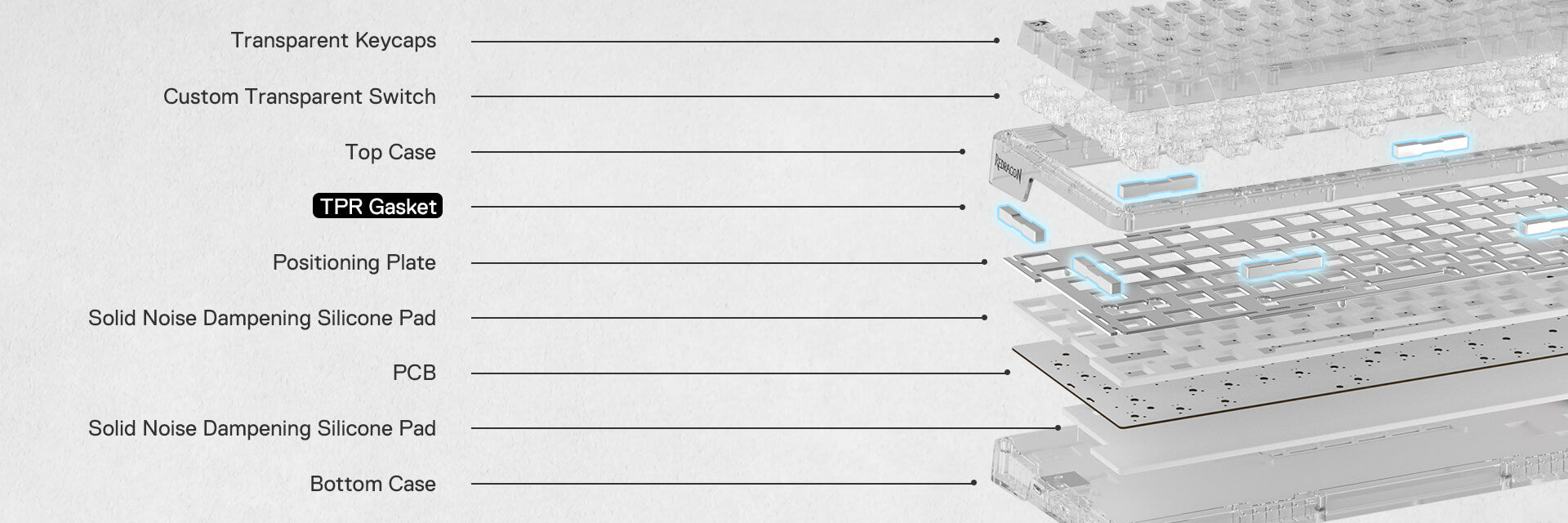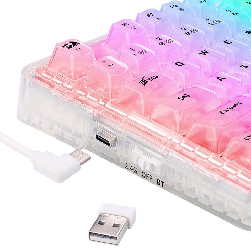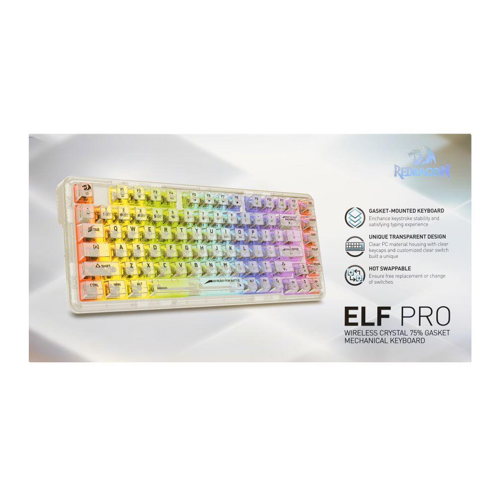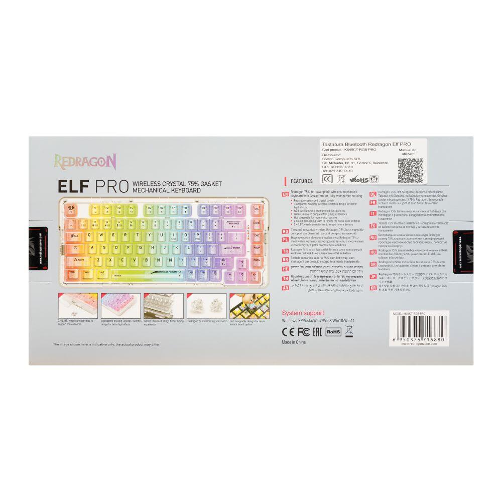 Tastatura gaming mecanica Bluetooth cu si fara fir Redragon Elf PRO transparenta iluminare RGB, sasiu din plastic transparent, switch-uri Redragon transparente, keycaps-uri transparente, toate tastele fara conflict - 68 taste (n-key rollover), protocol bluetooth: 5.0, se pot conecta 3 device-uri simultan (se selecteaza device-ul pe care il folositi din combinatia de taste FN si 1, 2,si 3), baterie: 3000mAh, protocol wireless 2.4 Ghz. iluminare LED RGB a tastelor (20 moduri de iluminare, reglarea intensitatii), EVA Silencer Foam instalata in interiorul tastaturii, gasket din silicon, tasta WIN poate fi dezactivata in timpul jocurilor, 8 taste multimedia, include switch-uri de schimb, compatibila cu mojoritatea switch-urilor, conector USB Type-C, cablu USB detasabil (cablu cu conectori USB Type-C si adaptor pentru USB Type A), dimensiuni: 335x140x37mm, greutate: 950g