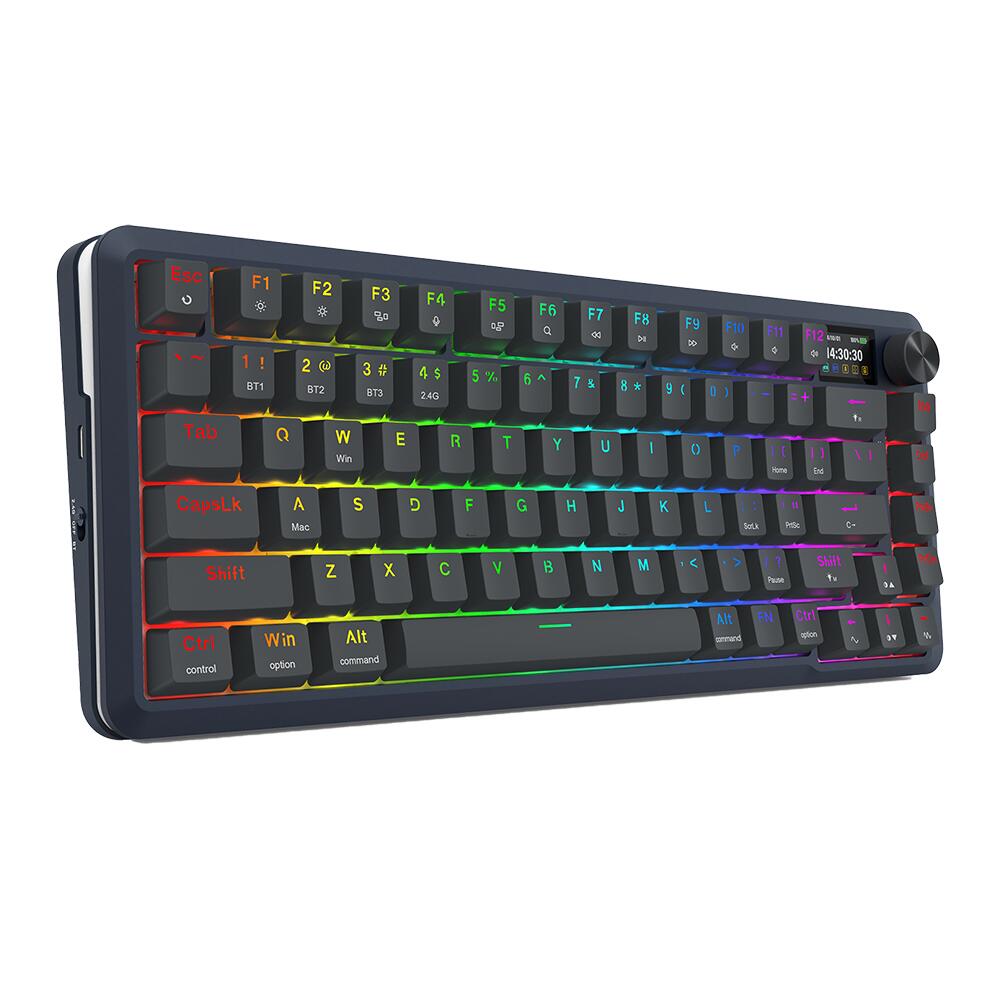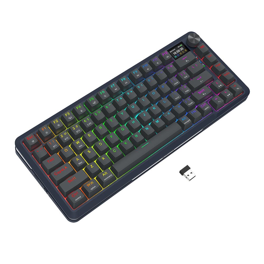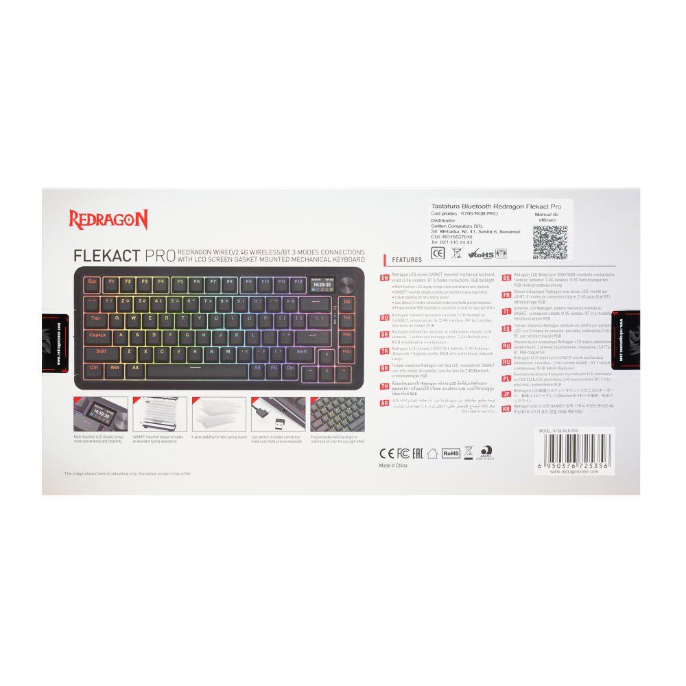 Tastatura gaming mecanica Bluetooth cu si fara fir Redragon Flekact Pro neagra iluminare RGB, sasiu din plastic, switch-uri Redragon roz, keycaps-uri din ABS, toate tastele fara conflict – 81 taste (n-key rollover), protocol bluetooth: 5.0, se pot conecta 3 device-uri simultan (se selecteaza device-ul pe care il folositi din swith-ul de pa laterala tastaturii), baterie: 4000mAh, protocol wireless 2.4 Ghz. iluminare LED RGB a tastelor (20 moduri de iluminare, reglarea intensitatii), display oLED 1.41 inch customizabil, rotita pentru reglarea volumului si a luminozitatii, EVA Silencer Foam instalata in interiorul tastaturii, gasket din silicon, tasta WIN poate fi dezactivata in timpul jocurilor, 6 taste multimedia, include switch-uri de schimb, compatibila cu mojoritatea switch-urilor, conector USB Type-C, cablu USB detasabil (cablu cu conectori USB Type-C si adaptor pentru USB Type A), dimensiuni: 335x140x43mm, greutate: 807g