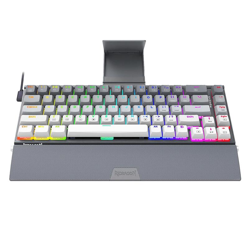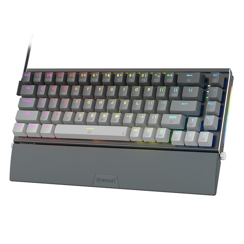 Tastatura gaming mecanica Bluetooth cu si fara fir Redragon Shaco PRO gri iluminare RGB, sasiu din aluminiu, switch-uri Redragon rosii, toate tastele fara conflict - 68 taste (n-key rollover), protocol bluetooth: 5.0, se pot conecta 3 device-uri simultan (se selecteaza device-ul pe care il folositi din combinatia de taste FN si Q, W,si E), baterie: 1600mAh, protocol wireless 2.4 Ghz. iluminare LED RGB a tastelor (20 moduri de iluminare, reglarea intensitatii), key caps-uri din PBT, EVA Silencer Foam instalata in interiorul tastaturii, tasta WIN poate fi dezactivata in timpul jocurilor, 6 taste MACRO, 7 taste multimedia, include switch-uri de schimb, palmrest detasabil, suport de telefon sau tableta detasabil, conector USB Type-C, cablu USB detasabil (cablu cu conectori USB Type-C si adaptor pentru USB Type A), dimensiuni: 320x167x37mm, greutate: 1105g