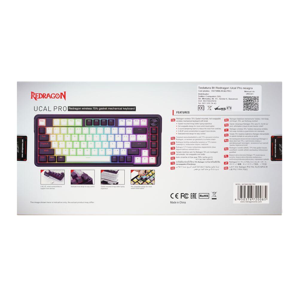 Tastatura gaming mecanica Bluetooth cu si fara fir Redragon Ucal Pro neagra cu alb iluminare RGB, sasiu din plastic, switch-uri Redragon rosii, keycaps-uri din PBT, toate tastele fara conflict – 81 taste (n-key rollover), protocol bluetooth: 5.0, se pot conecta 3 device-uri simultan (se selecteaza device-ul pe care il folositi din swith-ul de pa laterala tastaturii), baterie: 3000mAh, protocol wireless 2.4 Ghz. iluminare LED RGB a tastelor (20 moduri de iluminare, reglarea intensitatii), rotita pentru reglarea volumului si a luminozitatii, EVA Silencer Foam instalata in interiorul tastaturii, gasket din silicon, tasta WIN poate fi dezactivata in timpul jocurilor, 8 taste multimedia, include switch-uri de schimb, compatibila cu mojoritatea switch-urilor, conector USB Type-C, cablu USB detasabil (cablu cu conectori USB Type-C si adaptor pentru USB Type A), dimensiuni: 335x140x37mm, greutate: 917g