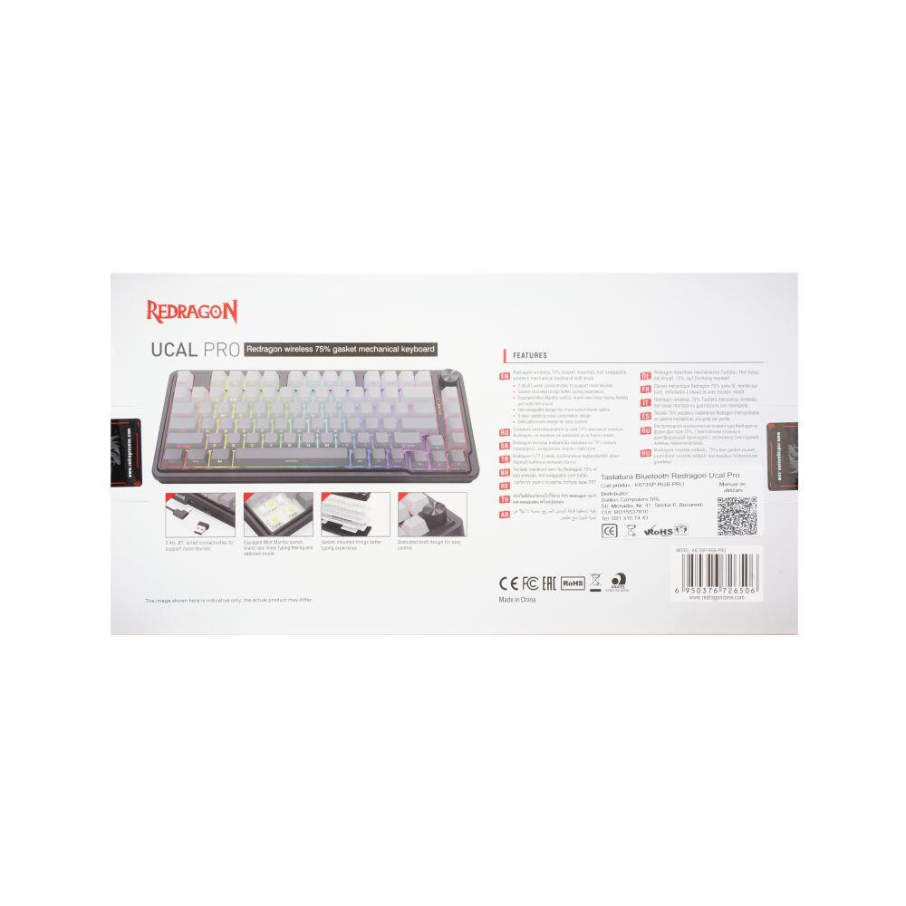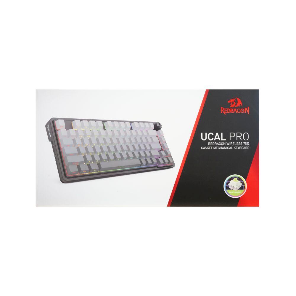 Tastatura gaming mecanica Bluetooth cu si fara fir Redragon Ucal Pro neagra cu gri degrade iluminare RGB, sasiu din plastic, switch-uri liniare Redragon Mint Mambo, keycaps-uri din PBT cu caracterele gravate pe partea sudica, toate tastele fara conflict – 81 taste (n-key rollover), protocol bluetooth: 5.0, se pot conecta 3 device-uri simultan (se selecteaza device-ul pe care il folositi din swith-ul de pa laterala tastaturii), baterie: 3000mAh, protocol wireless 2.4 Ghz. iluminare LED RGB a tastelor (20 moduri de iluminare, reglarea intensitatii), rotita pentru reglarea volumului si a luminozitatii, EVA Silencer Foam instalata in interiorul tastaturii, gasket din silicon, tasta WIN poate fi dezactivata in timpul jocurilor, 8 taste multimedia, include switch-uri de schimb, compatibila cu mojoritatea switch-urilor, conector USB Type-C, cablu USB detasabil (cablu cu conectori USB Type-C si adaptor pentru USB Type A), dimensiuni: 335x140x37mm, greutate: 917g