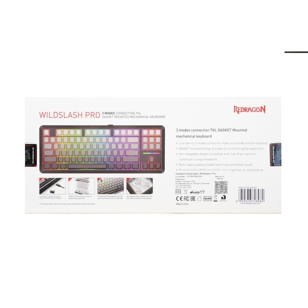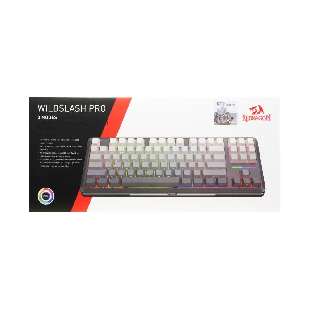 Tastatura gaming mecanica Bluetooth cu si fara fir Redragon Wildslash Pro neagra cu gri degrade iluminare RGB, switch-uri liniare Redragon RPC, keycaps-uri din PBT, toate tastele fara conflict – 87 taste (n-key rollover), protocol bluetooth: 5.0, se pot conecta 3 device-uri simultan (se selecteaza device-ul pe care il folositi din swith-ul de pe spatele tastaturii), baterie: 4000mAh, protocol wireless 2.4 Ghz, garnituri din silicon si spuma EVA, iluminare LED RGB a tastelor (20 moduri de iluminare, reglarea intensitatii), tasta WIN poate fi dezactivata in timpul jocurilor, posibilitate inregistrare MACRO-uri pe orice tasta, compatibila MAC, suporta layout MAC (se shimba din swith-ul de pe spatele tastaturii), compatibila cu majoritatea switch-urilor, conector USB Type-C, cablu USB detasabil, dimensiuni: 373x140x43mm, greutate: 0.94Kg