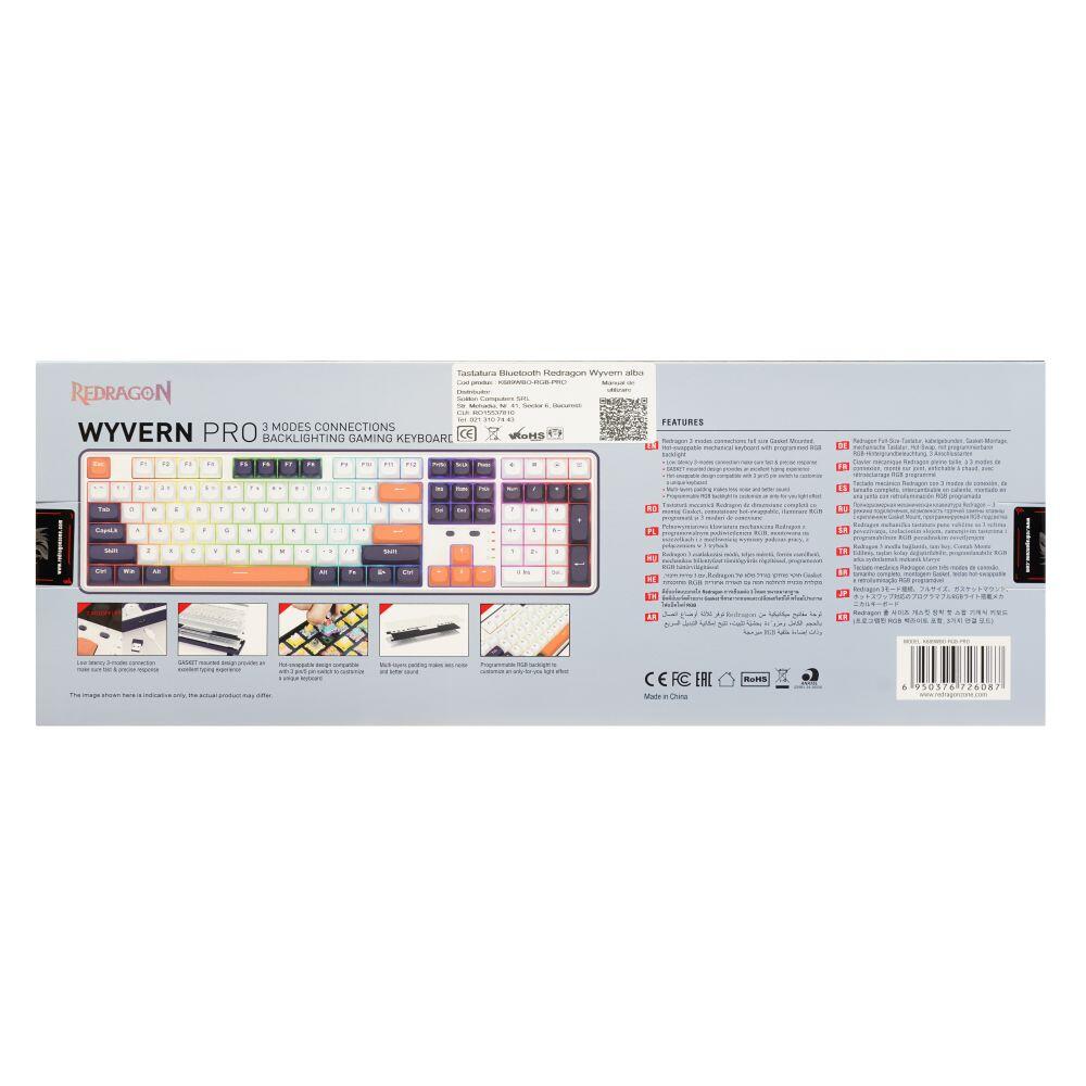 Tastatura gaming mecanica Bluetooth cu si fara fir Redragon Wyvern alba cu portocaliu iluminare RGB, switch-uri liniare Mint Mambo, keycaps-uri din PBT, toate tastele fara conflict – 108 taste (n-key rollover), protocol bluetooth: 5.0, se pot conecta 3 device-uri simultan (se selecteaza device-ul pe care il folositi din switch-ul de deasupra sagetilor), baterie: 3000mAh, protocol wireless 2.4 Ghz, garnituri din silicon si spuma EVA, iluminare LED RGB a tastelor (20 moduri de iluminare, reglarea intensitatii), tasta WIN poate fi dezactivata in timpul jocurilor, posibilitate inregistrare MACRO-uri pe orice tasta, compatibila MAC, suporta layout MAC (se shimba din switch-ul de deasupra sagetilor), compatibila cu majoritatea switch-urilor, conector USB Type-C, cablu USB detasabil, dimensiuni: 444x133x37mm, greutate: 0.81Kg
