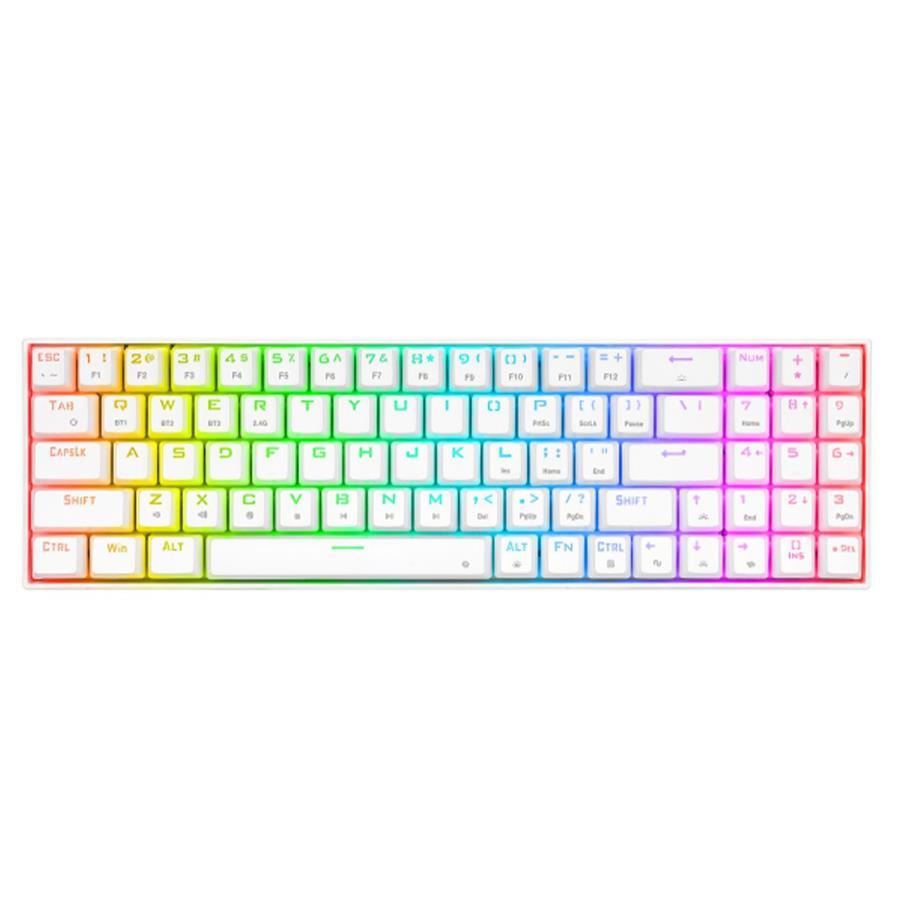 Tastatura gaming mecanica Bluetooth cu si fara fir Redragon Zed Pro alba iluminare RGB, toate tastele fara conflict, switch-uri maro Redragon (durata de viata: 50 de milioane de apasari), include switch-uri de schimb, protocol bluetooth: 5.0, se pot conecta 3 device-uri simultan (se selecteaza device-ul pe care il folositi din combinatia de taste “FN” si “Q”, “W” si “E”), baterie: 1600mAh, protocol wireless 2.4 Ghz, iluminare LED RGB a tastelor (posibilitatea reglarea intensitatii luminoase, 20 moduri de iluminare), tasta WIN poate fi dezactivata in timpul jocurilor, soft pentru configurare, caracterele de pe taste nu se sterg datorita constructiei prin injectie dubla de plastic (double shot injection keycaps), cablu detasabil, conector USB Type-C, dongle wireless USB, dimensiuni: 349x102x34mm, greutate: 674g