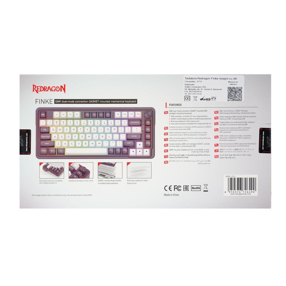 Tastatura gaming mecanica Bluetooth si cu fir Redragon Finke neagra cu alb iluminare RGB, switch-uri liniare Redragon gri, toate tastele fara conflict – 81 taste (n-key rollover), protocol bluetooth: 5.0, baterie: 3000mAh, iluminare LED RGB a tastelor (20 moduri de iluminare, reglarea intensitatii), rotita pentru reglarea volumului si a luminozitatii, tasta WIN poate fi dezactivata in timpul jocurilor, 6 taste multimedia, include switch-uri de schimb, compatibila cu mojoritatea switch-urilor, conector USB Type-C, cablu USB detasabil, dimensiuni: 335x140x37mm, greutate: 0.9Kg